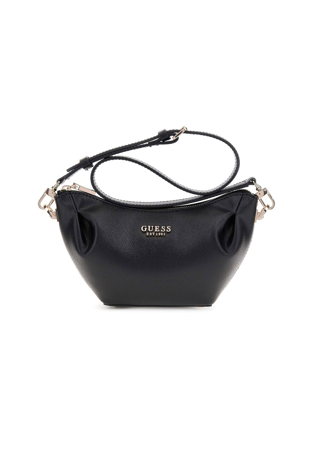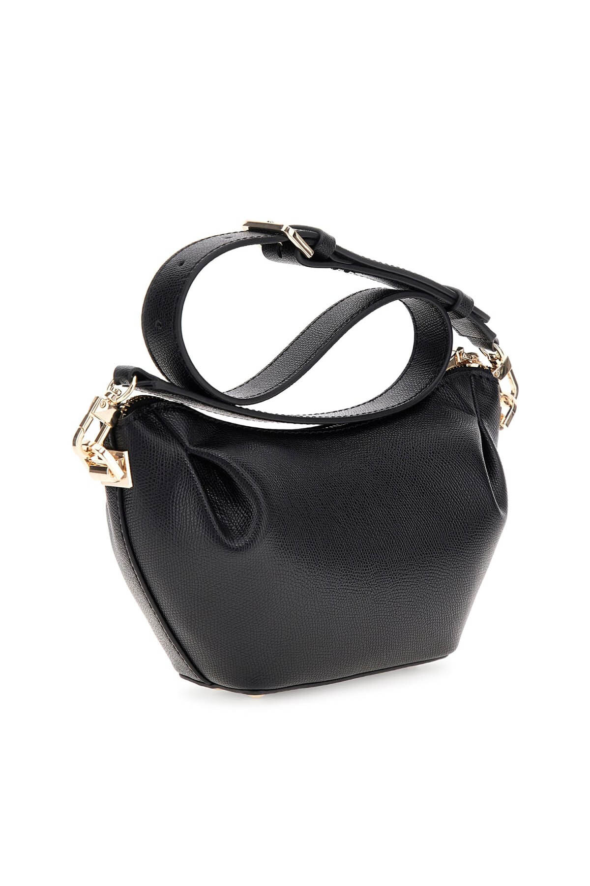 Yumuşak ve modern bir silüete sahip bu çanta, üst köşelerindeki büzgülü detaylarıyla özgün bir tasarım sunar. Dokulu siyah yüzeyi ve akıcı formu, çantaya feminen ve şık bir hava katar. Ön yüzeydeki minimalist metal yazı detayı, çantanın sade şıklığını vurgular. Ayarlanabilir omuz askısı, hem omuzda hem de çapraz olarak konforlu bir kullanım imkanı tanır.