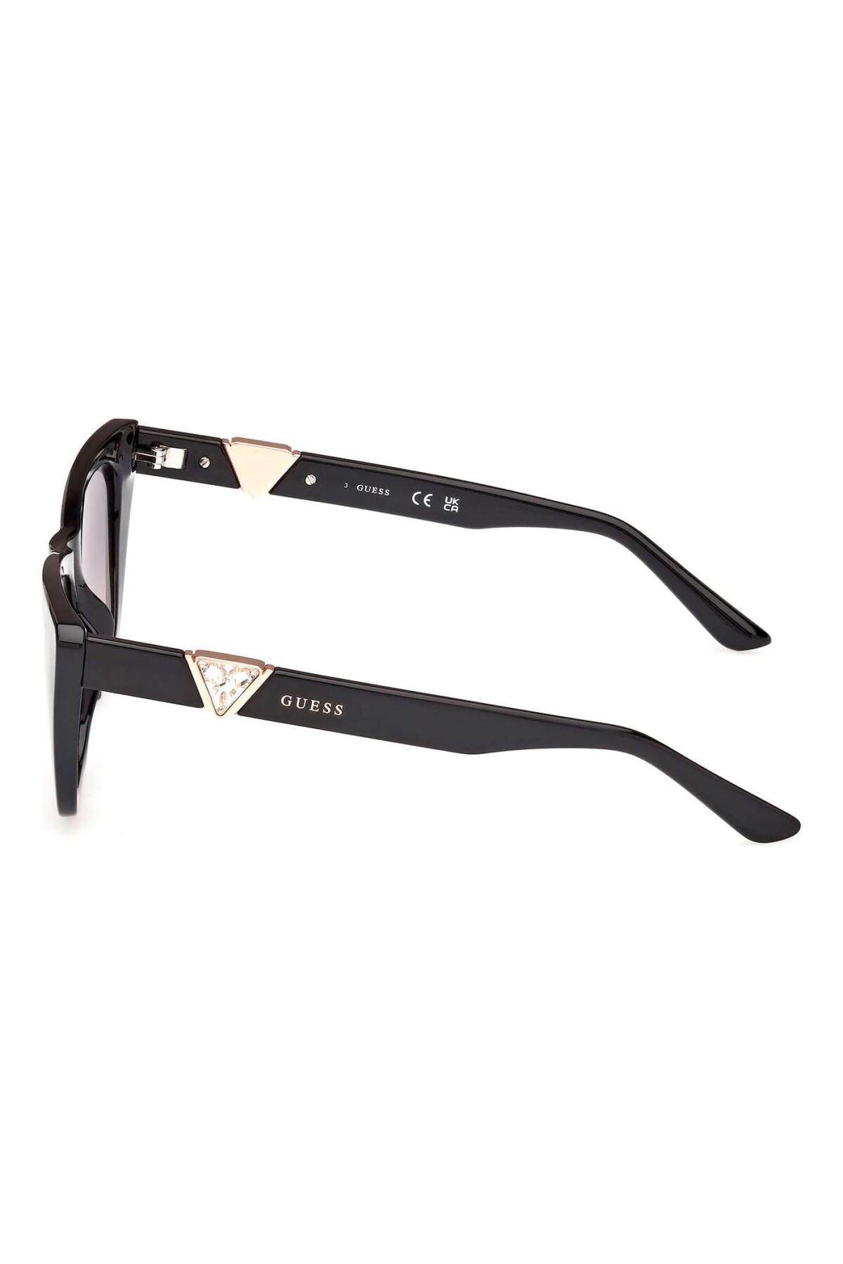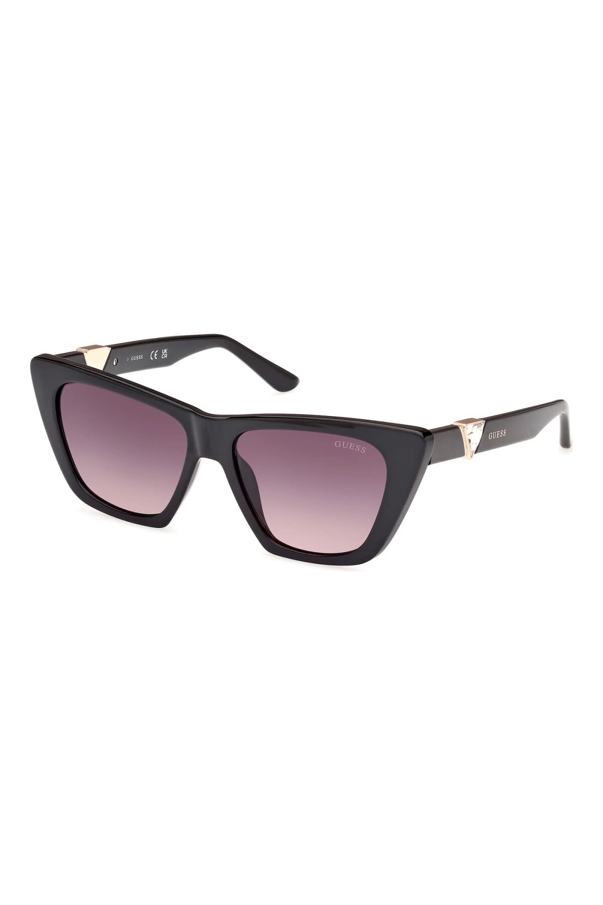 Göz alıcı ve iddialı bir stil için tasarlanan bu keskin hatlı çekik (cat-eye) güneş gözlüğü, modern cazibenin tanımını yapıyor. Parlak siyah asetat malzemeden üretilen ve dramatik bir silüet sunan çerçeve, feminen ve güçlü bir duruş sergiler. Degrade camları, gizemli bir derinlik katarken konforlu bir görüş sağlar. Tasarımın lüks imzasını, saplarda yer alan ve ışıltı katan üçgen formundaki metal mücevher detayı oluşturur.