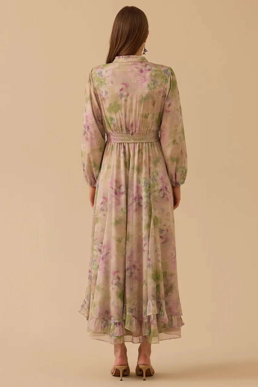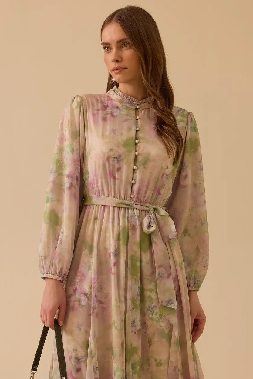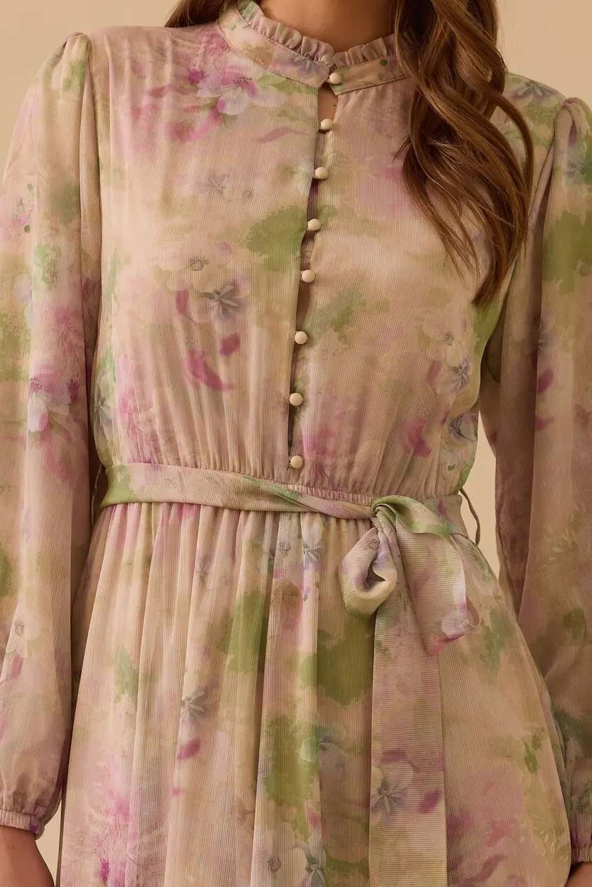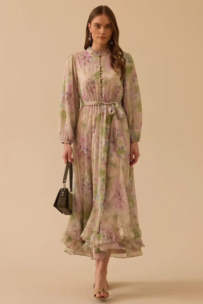 Doğanın romantizmini stilinize taşıyan bu pembe şifon elbise, zarif çiçek desenleri ve uçuş uçuş fırfır detaylarıyla büyüleyici bir duruş sergiler. Hakim yaka ve balon kol tasarımıyla klasik ve modern estetiği harmanlayan bu parça, akışkan formuyla her adımda zarif bir hareketlilik sunar.