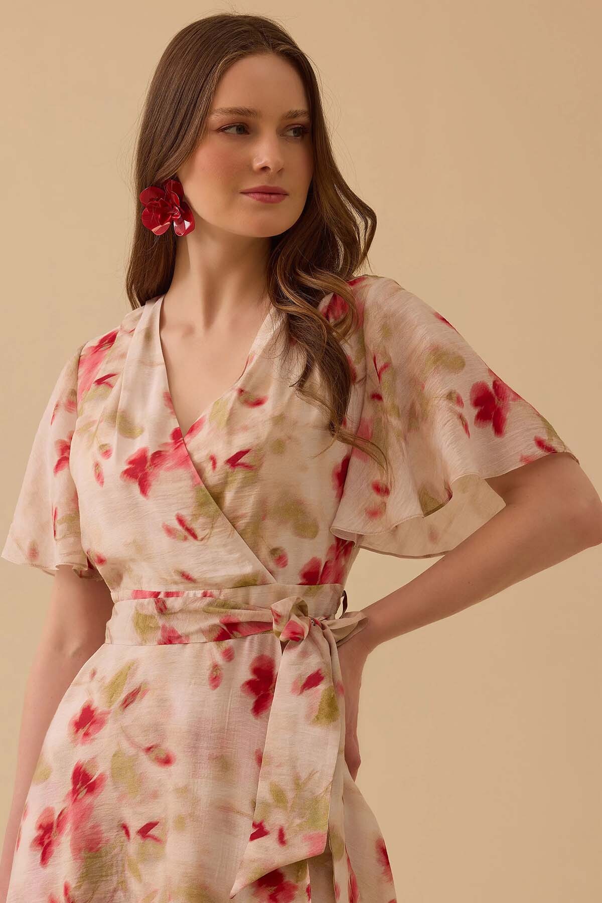 Modern ve sanatsal desenlerin pudra tonlarıyla buluştuğu bu elbise, stilinde zarif ve romantik bir fark yaratmak isteyen kadınlar için ideal bir tercih sunar. Tek omuzlu asimetrik yaka yapısı ve vücut hatlarını nazikçe takip eden formuyla hem şık davetlerde hem de sofistike günlük kombinlerde dikkatleri üzerinize çeker.