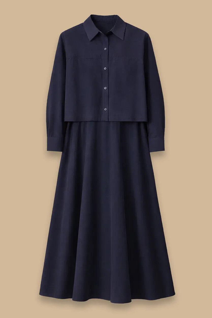 Rafine lacivert tonu ve dokuma kumaşının seçkin duruşuyla bu parça, ofis şıklığından akşam davetlerine kadar geniş bir kullanım yelpazesi sunuyor. Belindeki lastik detayıyla konforu ön plana çıkarırken, gömlek yaka kesimi ve maksi boyuyla silüetinize asil bir form kazandırıyor. İster tek parça bir elbise olarak zarafeti taşıyın, ister farklı kombinlerin üzerine şık bir dış katman olarak ekleyin; bu tasarım her kullanımda sofistike bir duruş sergiliyor.