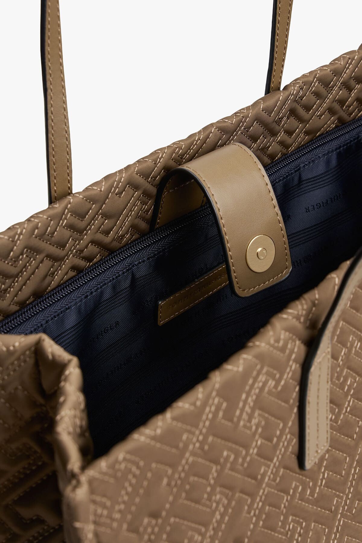 Detaylar: Ön yüzde gold renkli metal TH logo, deri omuz askıları, iç fermuarlı cep