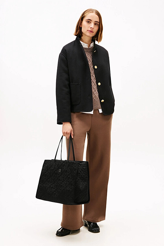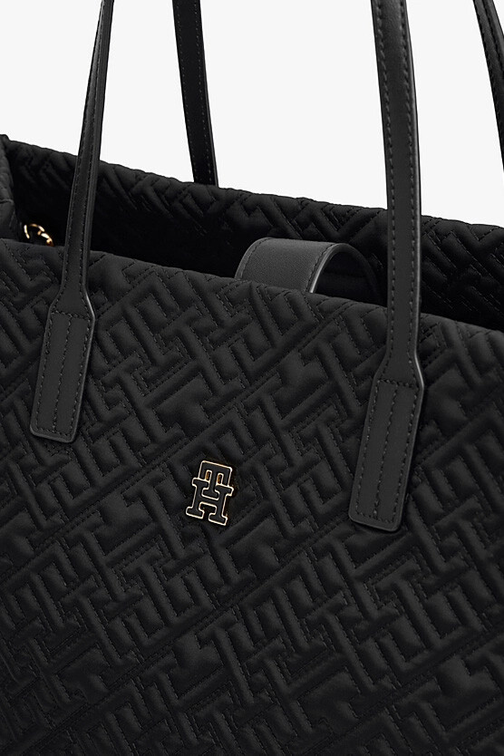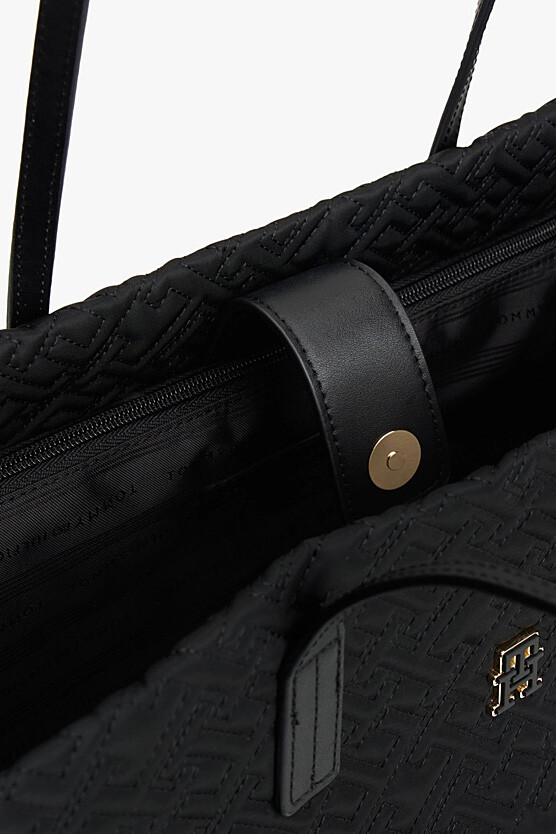 Siyahın asaletini ve parlak naylon dokusunu modern bir tasarımla buluşturan bu City Tote, hem şık hem de son derece işlevsel bir kullanım sunuyor. Çantanın yüzeyini kaplayan dikişli monogram deseni, tasarıma kapitone benzeri zengin bir doku ve derinlik kazandırıyor. %91 oranında geri dönüştürülmüş malzemeden üretilen çevre dostu gövdesi, %9 oranındaki gerçek deri kulp ve detaylarla tamamlanarak dayanıklılığı artırılmıştır. 23 litrelik geniş iç hacmi ve 43 cm'lik genişliği, laptopunuzdan günlük alışverişlerinize kadar her şeyi rahatlıkla taşımanızı sağlarken; ağız kısmındaki şık mıknatıslı kemer kapama sistemi pratik bir erişim sunar.