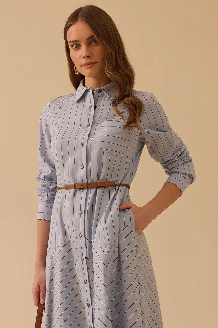 Modern çizgilerin klasik gömlek yaka tasarımıyla buluştuğu bu mavi elbise, hem şehir hayatında hem de günlük kullanımda zahmetsiz bir zarafet sunar. %100 Pamuk dokusuyla nefes alan bir konfor sağlarken, belindeki kemer detayı silüetinizi zarifçe vurgulayarak feminen bir duruş sergiler.