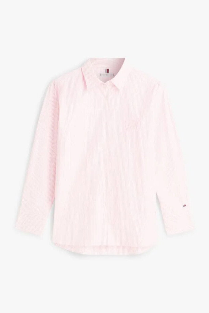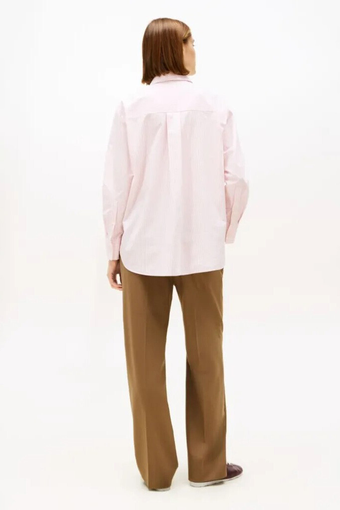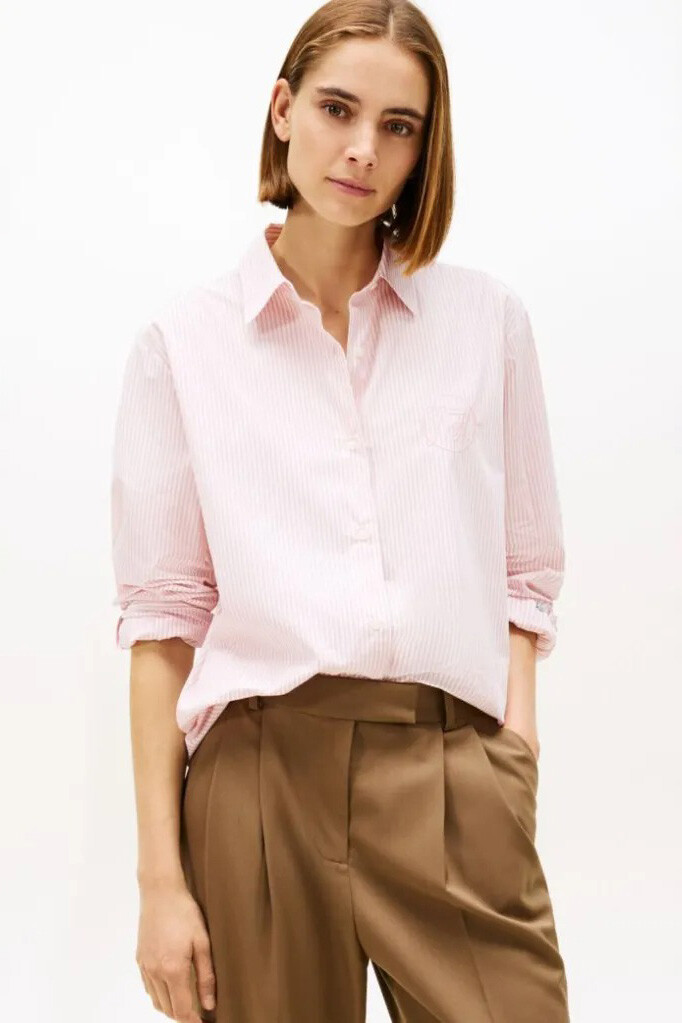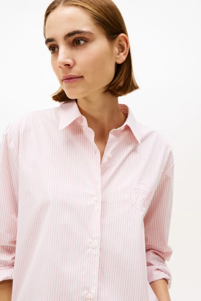 %100 pamuklu dokusunun sunduğu doğal nefes alabilirlik ve yumuşaklık hissi ile gün boyu süren bir konfor deneyimi sunar. Klasik dikey çizgi desenini modern bir formla buluşturan bu gömlek, vücudu sarmayan geniş ve rahat kesimiyle (oversized) mevsimsiz ve çabasız bir şıklık yaratır. Göğüs kısmındaki zarif nakış detayı, minimalist tasarıma sofistike bir dokunuş katar. Arkadaki pile detayı ve dökümlü yapısı ise hareket özgürlüğünü destekleyerek hem ofis stilinde hem de günlük kombinlerde anahtar parça rolü üstlenir.