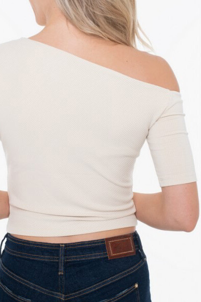 Detay: Fitilli ribana kumaş yapısı, asimetrik omuz kesimi