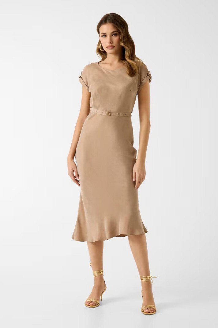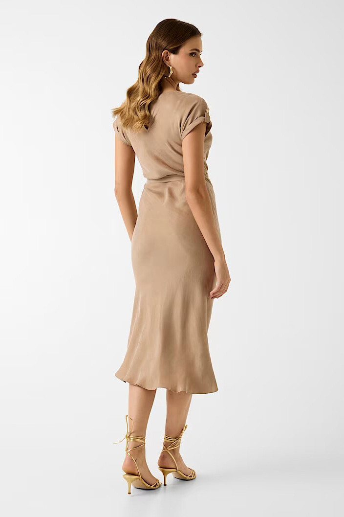 Lyocell ve viskoz karışımlı ipeksi dokusu sayesinde cildinizde ferah bir his bırakan bu maksi elbise, açık kahverenginin huzur veren enerjisiyle hem şık davetlerde hem de günlük şehir şıklığında göz kamaştırıcı bir seçenek sunar.
