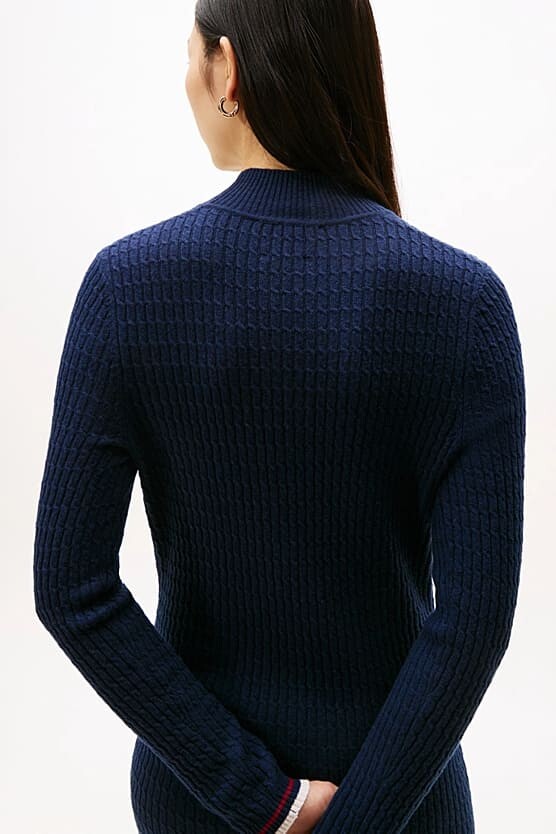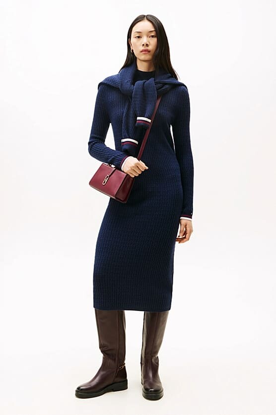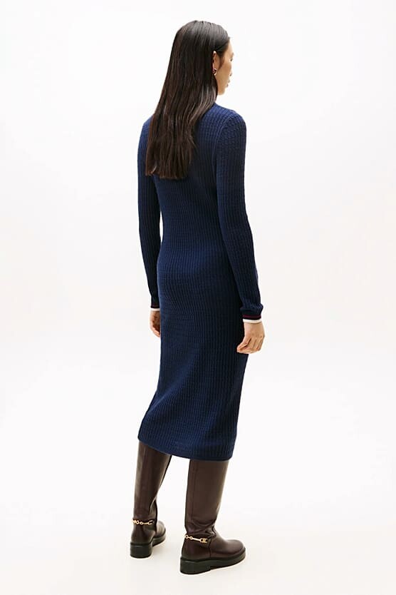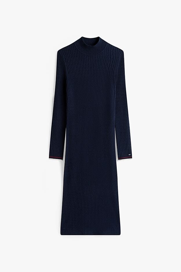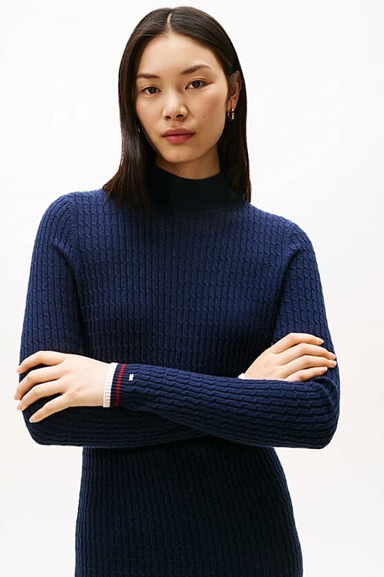 Soğuk aylar için şık ve sıcacık bir seçim olan bu triko elbise, zahmetsiz bir zarafet ve lüks bir konfor sunuyor. Zengin yün ve kaşmir karışımından üretilen elbise, baştan aşağı klasik saç örgü deseniyle dokulu bir görünüm kazanır. Vücudu nazikçe saran dar kalıbı, modern yarım balıkçı yakası ve zarif midi boyuyla sofistike bir silüet oluşturur. Manşetindeki minimalist amblem, tasarıma incelikli bir son dokunuş yapar.