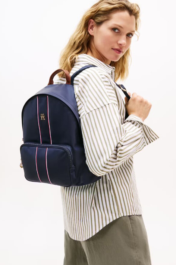 Günlük kullanım için hem şık hem de fonksiyonel bir seçenek olan bu sırt çantası, modern tasarımıyla öne çıkıyor. Dayanıklı polyester kumaşı ve kubbe formundaki yapısı, eşyalarınız için geniş bir saklama alanı sunar. Ön yüzündeki ikonik renkli dikey şerit ve üzerindeki parlak metal monogram logosu, tasarıma sofistike bir dokunuş katar. Ayarlanabilir omuz askıları ve deri görünümlü taşıma sapı konforlu bir kullanım sağlarken, fermuarlı ön gözü küçük eşyalarınıza kolay erişim imkanı tanır.