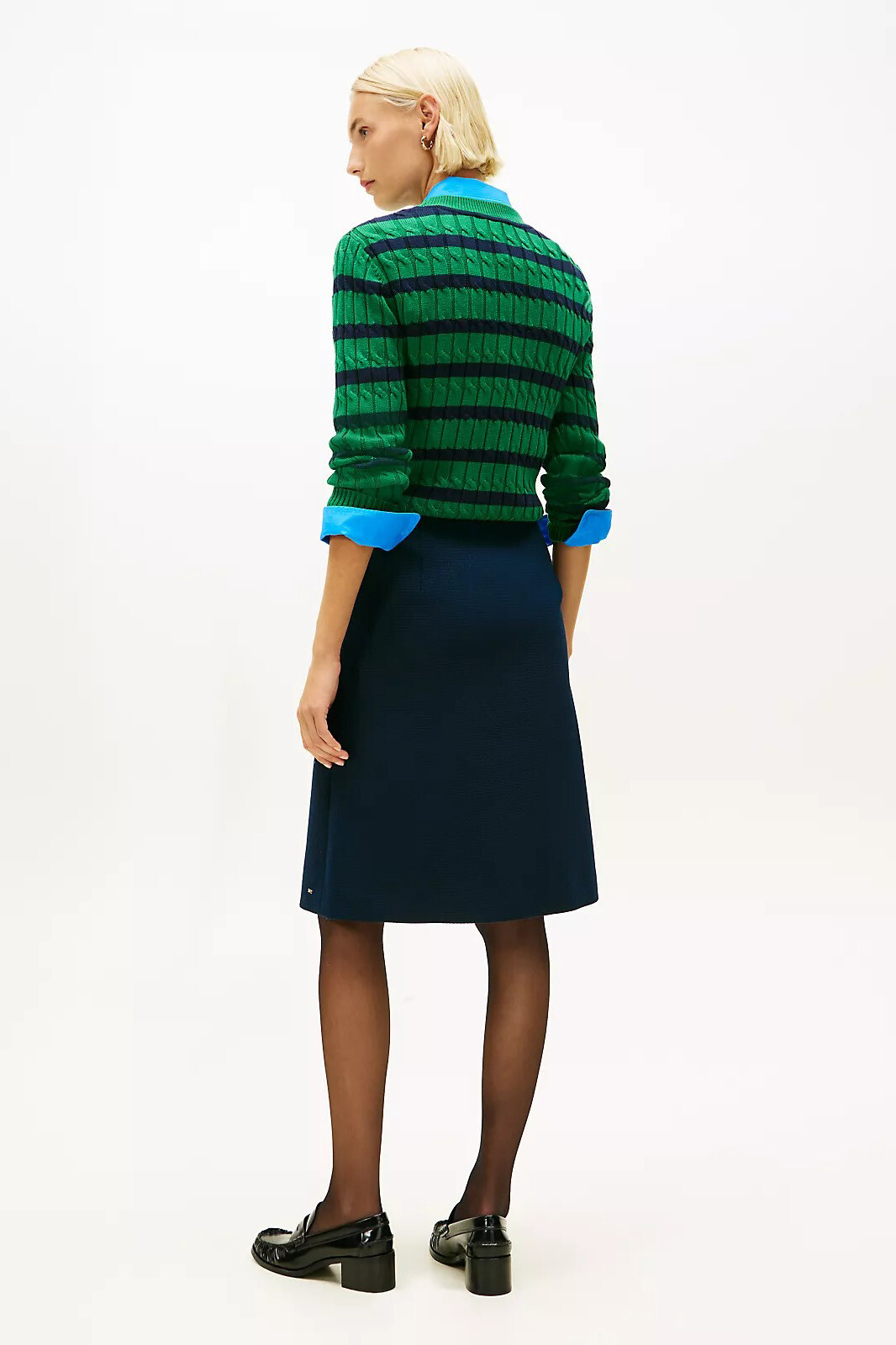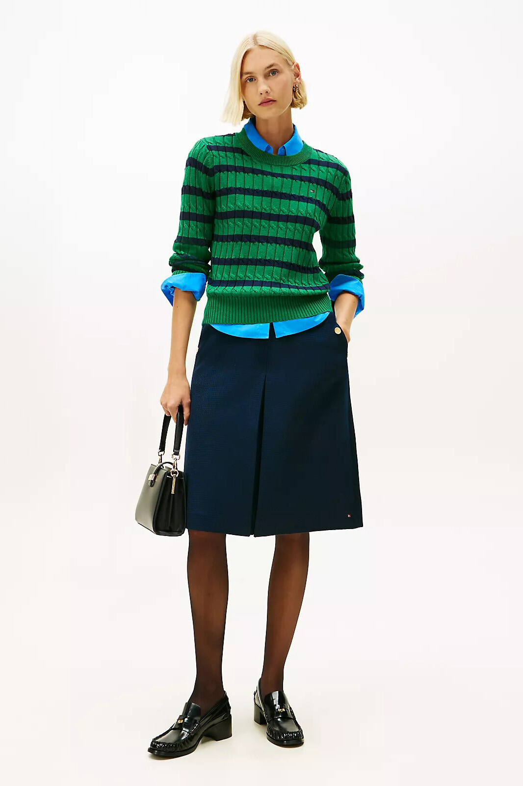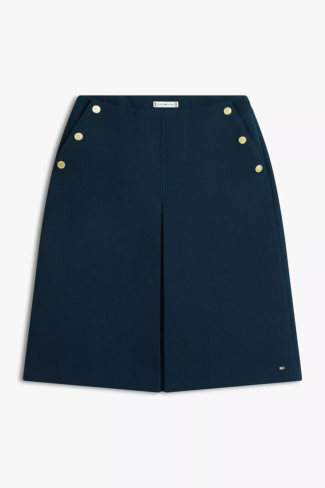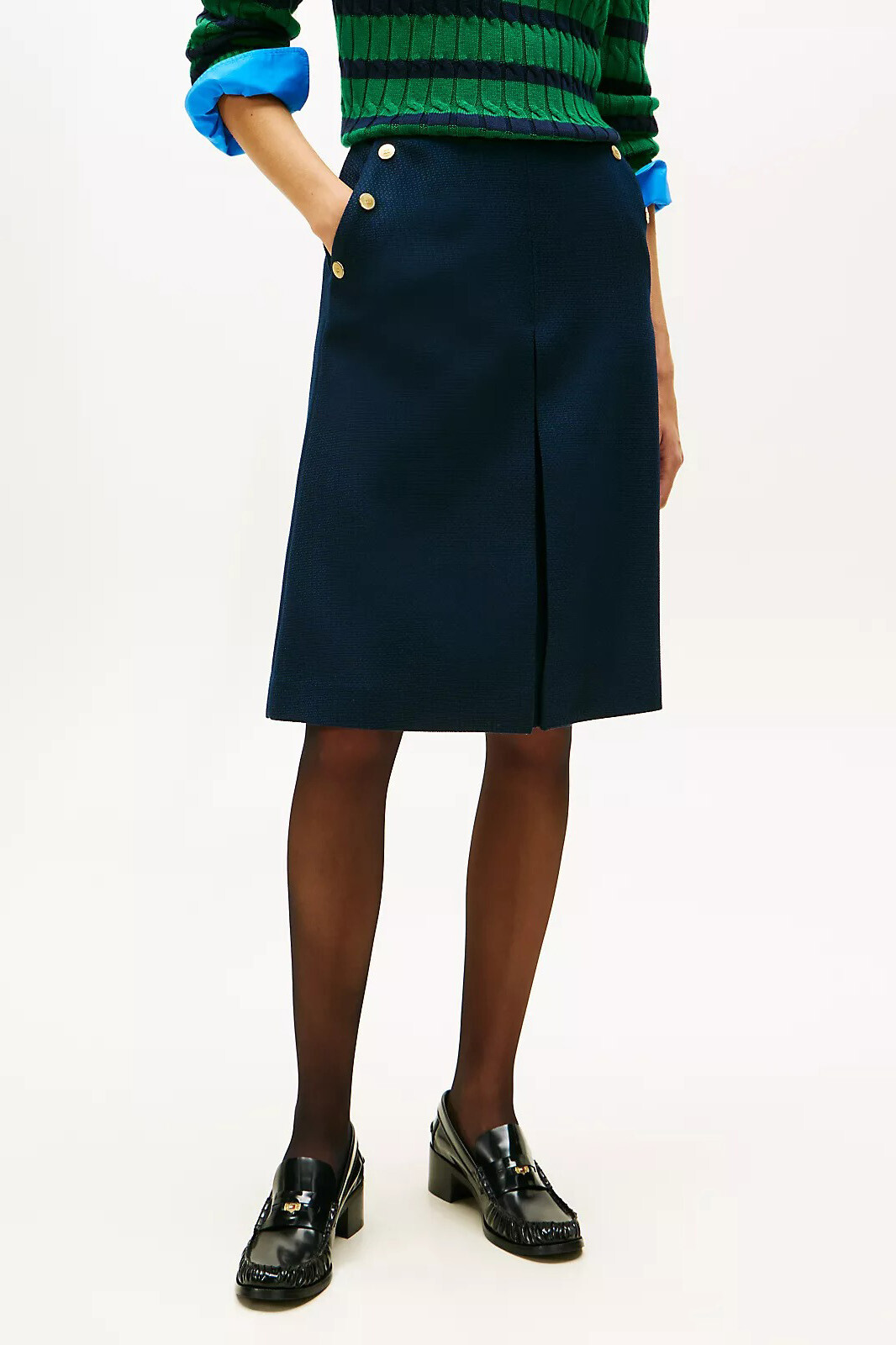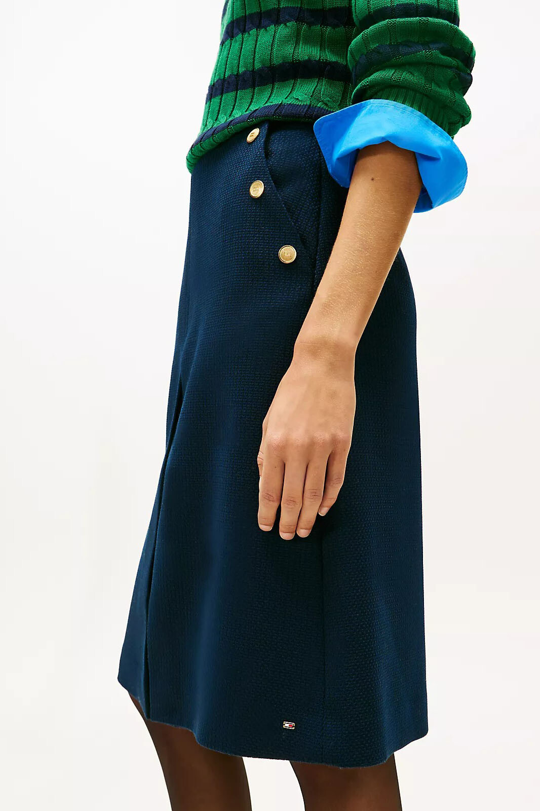 %50 yün ve %50 polyester karışımının sunduğu doğal sıcaklığı dayanıklı bir yapıyla birleştiren bu etek, dokulu kumaş yüzeyi ve kolej stiliyle sonbahar-kış gardırobunuza sofistike bir dokunuş katar. Lacivert zemin üzerinde belin iki yanında konumlandırılan gold renkli metal düğmeler, tasarıma lüks bir ışıltı ve klasik bir denizci havası kazandırır. Ön kısımdaki derin kase pile detayı, hem yürürken hareket özgürlüğü sağlar hem de eteğe modern ve hacimli bir form verir. Astarı sayesinde vücuda yapışmadan dökümlü durur ve çoraplı kullanımlarda konforu artırır. Diz hizasında biten ideal boyu ve esnemeyen tok duruşu, vücut hatlarını dengeli bir şekilde sararak asil bir silüet oluşturur.