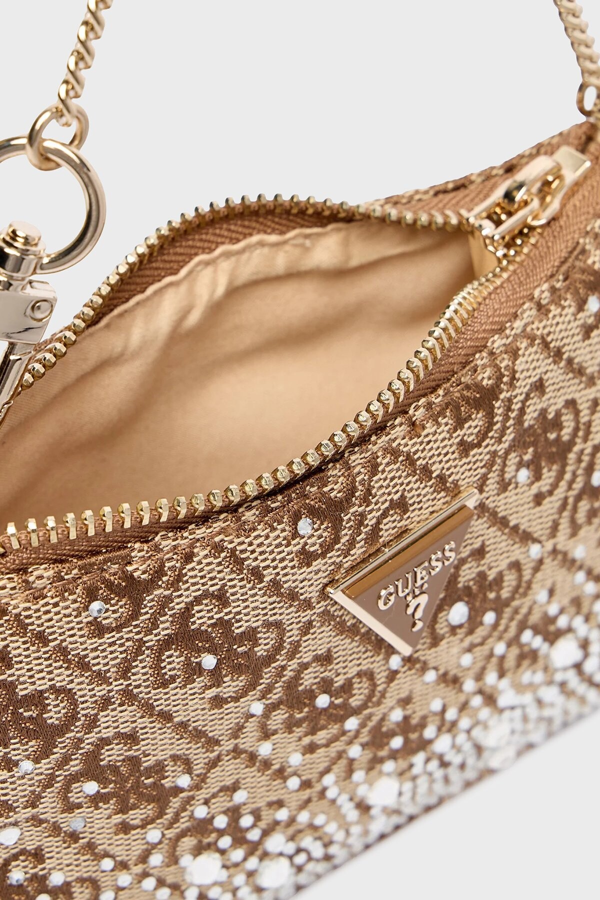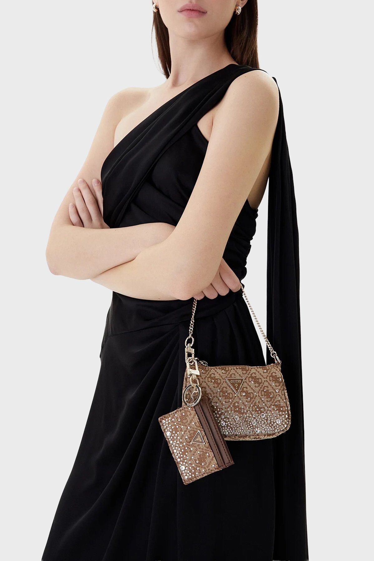 Tasarım: Taş işlemeli ve logo desenli yüzey, zincir askılı fermuarlı mini çanta, uyumlu kartlık