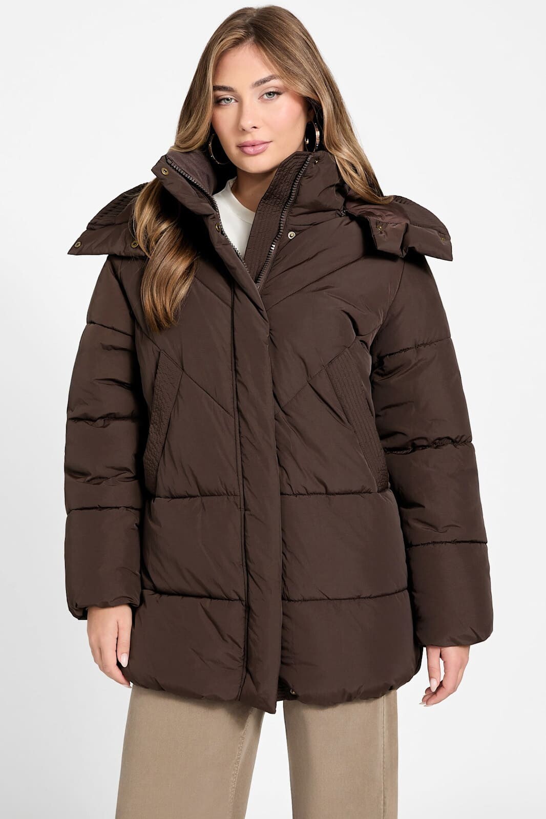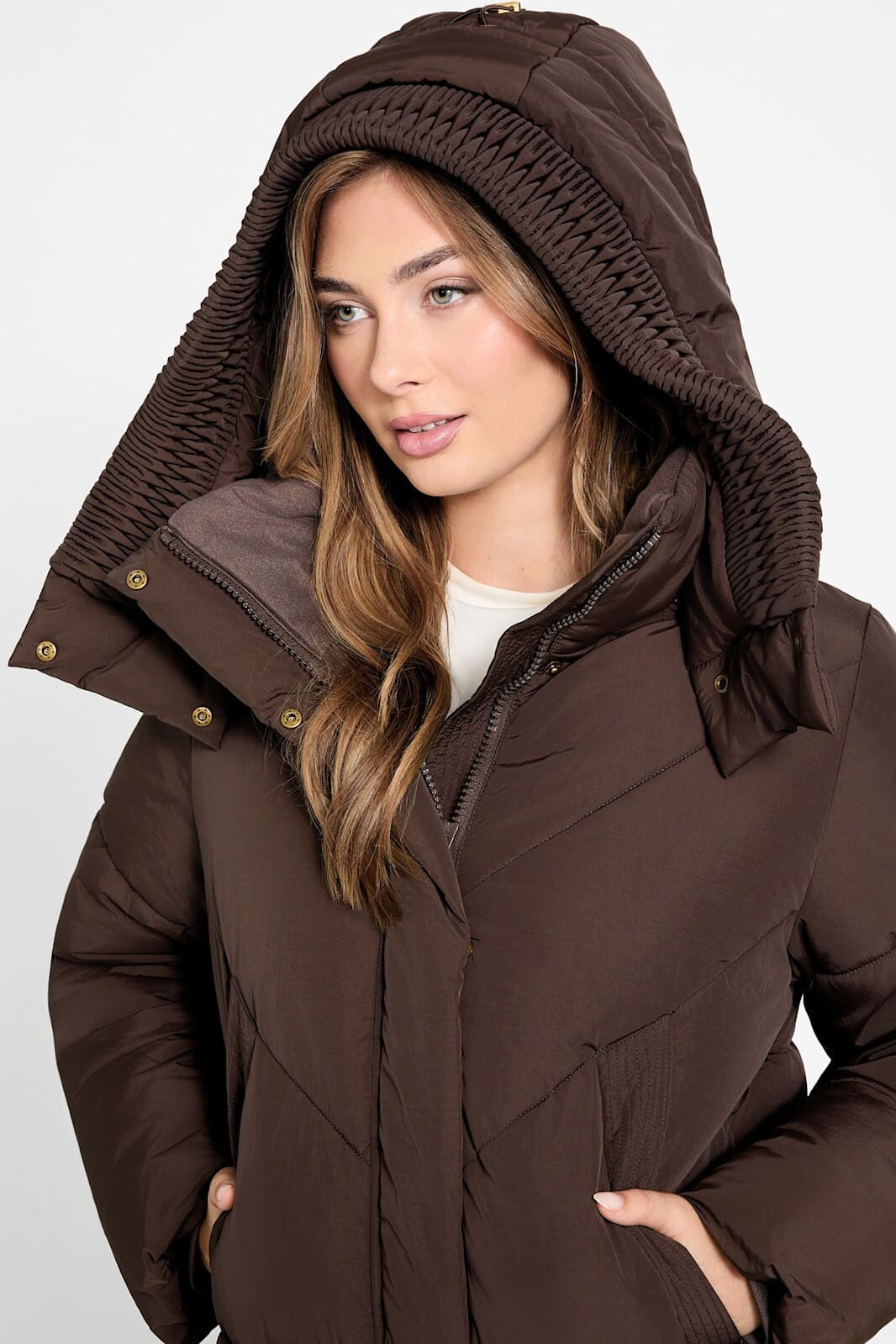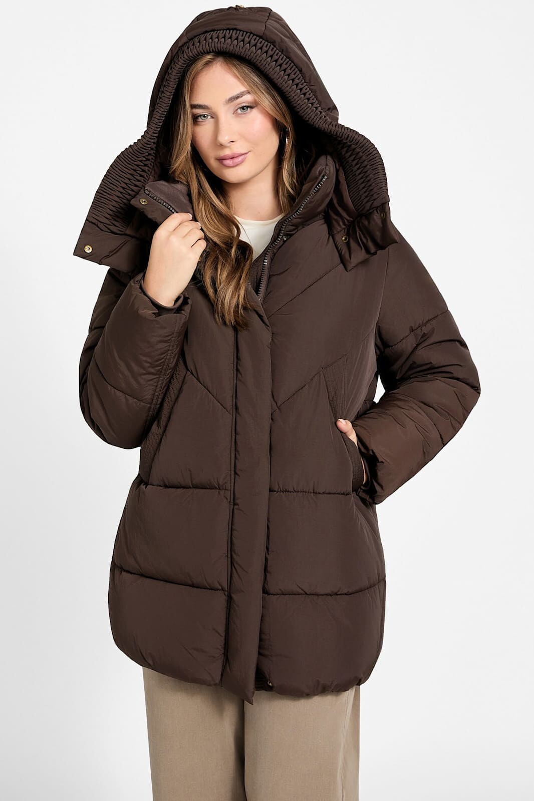Kış aylarının vazgeçilmezi olacak bu kahverengi şişme mont, modern kapitone dikişleri ve fonksiyonel tasarımıyla dikkat çeker. Göğüs kısmındaki V şeklindeki (chevron) dikiş detayları silüete dinamik ve zarif bir hava katarken, alt kısımdaki yatay şeritler klasik bir duruş sergiler. %60 Polyester ve %40 Polyamid karışımlı kumaşı, dayanıklılığı ve konforu bir arada sunar. Rüzgarı kesen yüksek yakası ve arkasında ayarlanabilir büzgü detayı bulunan geniş kapüşonu, soğuk havalarda ekstra koruma ve sıcaklık sağlar. Fermuarlı kapamanın üzerindeki çıtçıtlı koruma patı ısı kaybını önlerken, geniş yan cepleri ellerinizi sıcak tutmak için idealdir.