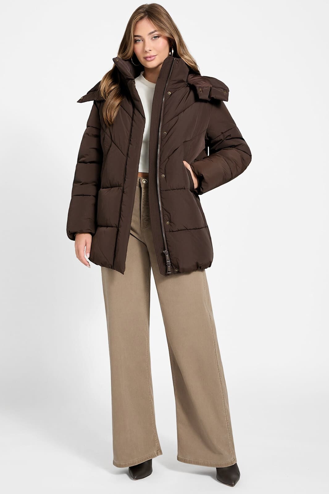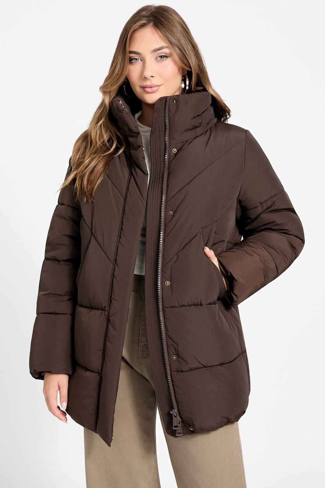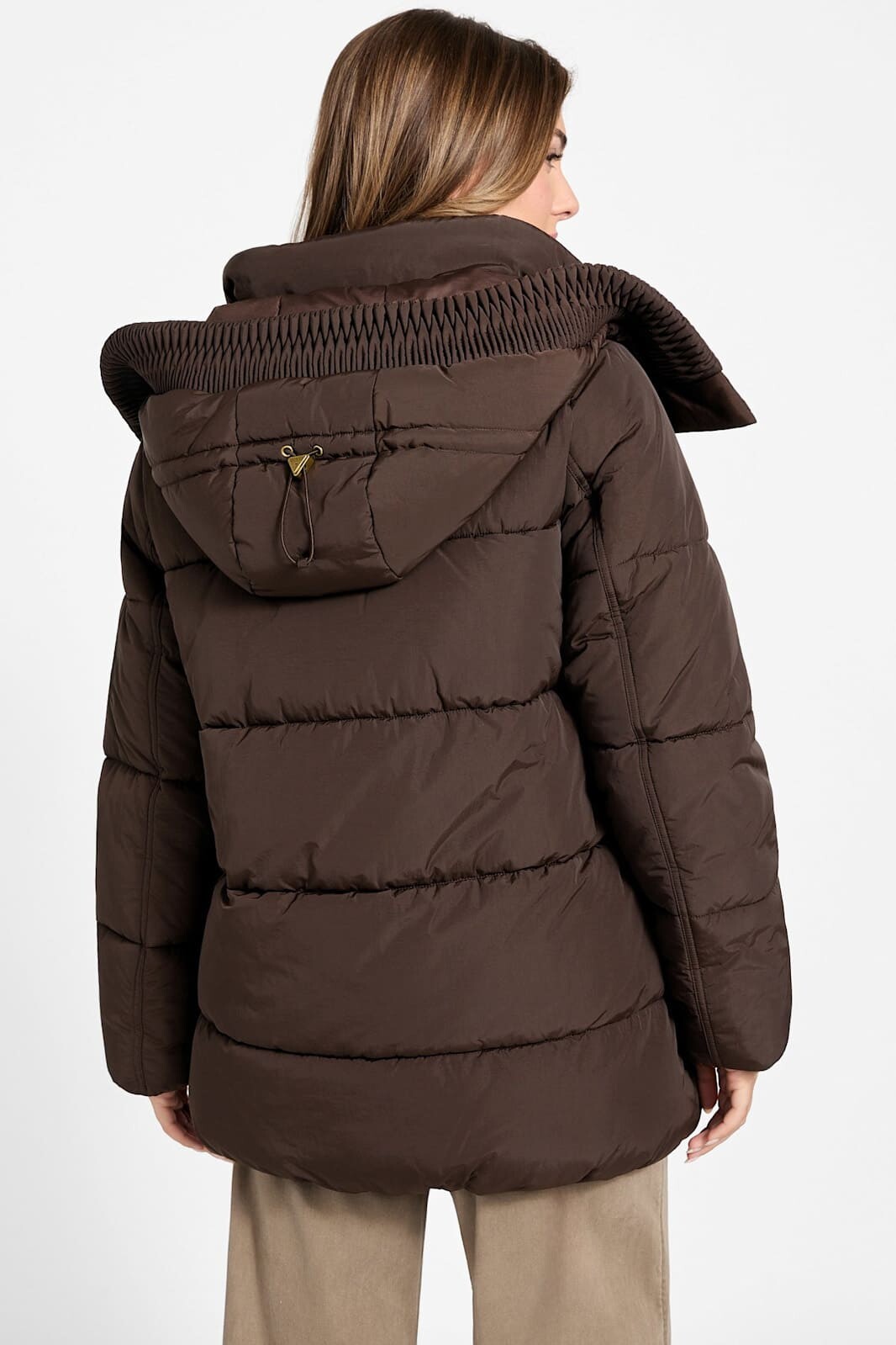 Kış aylarının vazgeçilmezi olacak bu kahverengi şişme mont, modern kapitone dikişleri ve fonksiyonel tasarımıyla dikkat çeker. Göğüs kısmındaki V şeklindeki (chevron) dikiş detayları silüete dinamik ve zarif bir hava katarken, alt kısımdaki yatay şeritler klasik bir duruş sergiler. %60 Polyester ve %40 Polyamid karışımlı kumaşı, dayanıklılığı ve konforu bir arada sunar. Rüzgarı kesen yüksek yakası ve arkasında ayarlanabilir büzgü detayı bulunan geniş kapüşonu, soğuk havalarda ekstra koruma ve sıcaklık sağlar. Fermuarlı kapamanın üzerindeki çıtçıtlı koruma patı ısı kaybını önlerken, geniş yan cepleri ellerinizi sıcak tutmak için idealdir.