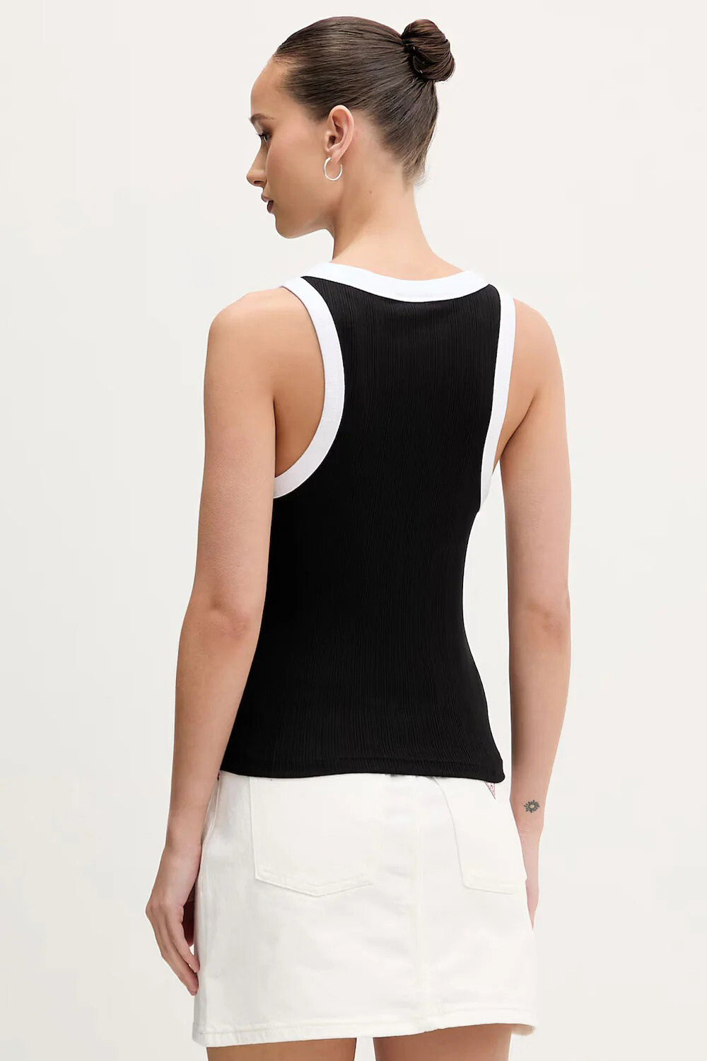 Guess Jeans koleksiyonunun modern ve dinamik ruhunu yansıtan Embro top, kontrast detayları ve fitilli dokusuyla şehir stilinize sportif bir şıklık katıyor. %78 pamuk, %47 modal ve %5 elastan karışımlı özel kumaşı, modalın ipeksi yumuşaklığını pamuğun nefes alan yapısıyla birleştirirken esnek dokusuyla vücudunuzu kusursuzca sarar. Siyah ana gövde üzerindeki beyaz yaka ve kol oyuntusu biyeleri, tasarıma ikonik bir retro-sportif hava kazandırır.