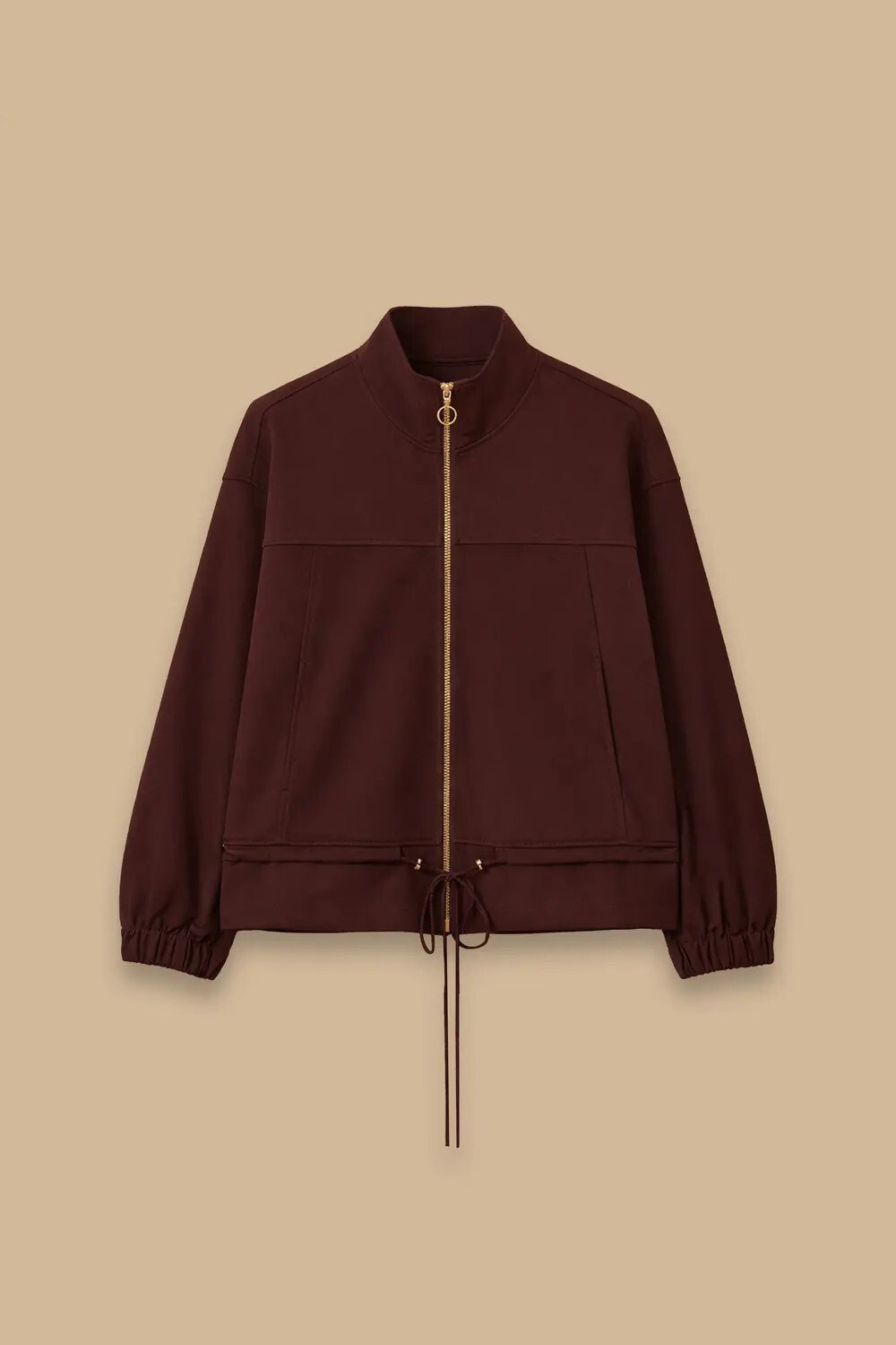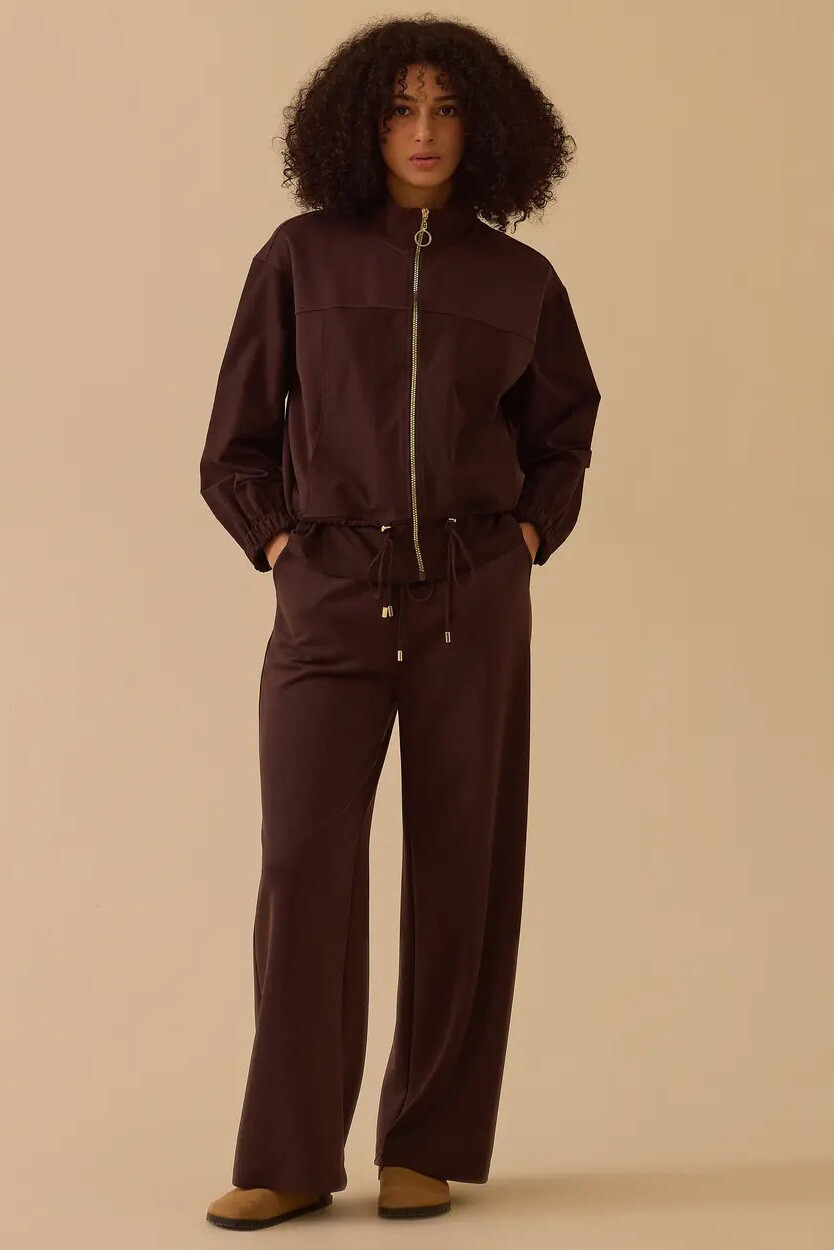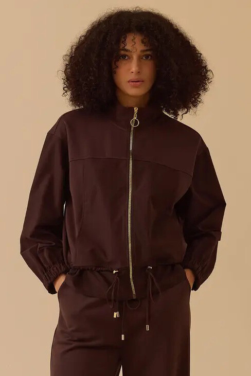 Kahverengi tonunun sıcak ve doğal karakterini sportif bir zarafetle buluşturan bu tasarım, günlük stilinize dinamik bir şıklık katmak için özenle hazırlandı. Altın yansımalı zarif fermuar detayı ve dik yakası silüetinize modern bir duruş kazandırırken; bel kısmındaki ayarlanabilir bağcık (büzgü) detayı formunuza göre şekil alarak feminen bir vurgu yapar. Düşük omuzlu dökümlü kesimi ve pamuk karışımlı yumuşak örme dokusuyla gün boyu üstün konfor sunan bu parça, hafta sonu yürüyüşlerinden kahve buluşmalarına kadar en pratik ve şık kurtarıcınızdır.