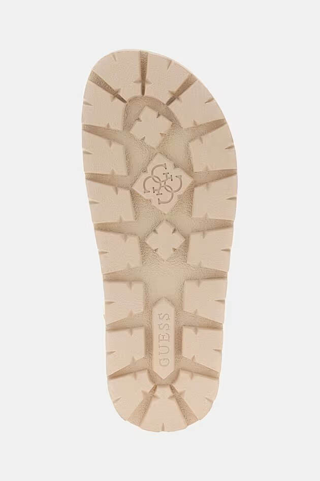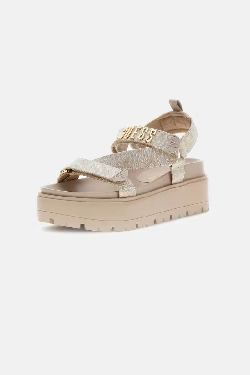 Modern ve dinamik bir tasarıma sahip olan Fetta sandalet, kalın platform tabanı ve ikonik marka detaylarıyla yaz stilinize hem yükseklik hem de üstün konfor katıyor. %93 polyester ve %7 poliüretan karışımlı dayanıklı materyal yapısı, uzun süreli kullanım ve esneklik sunar. Krem tonlarındaki şık görünümü, Guess'in karakteristik 4G logo baskılı tekstil bantlarıyla zenginleştirilerek markanın lüks estetiğini ön plana çıkarır.