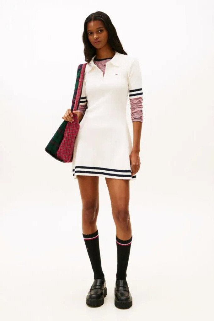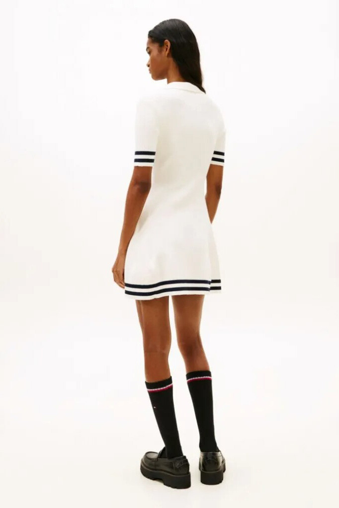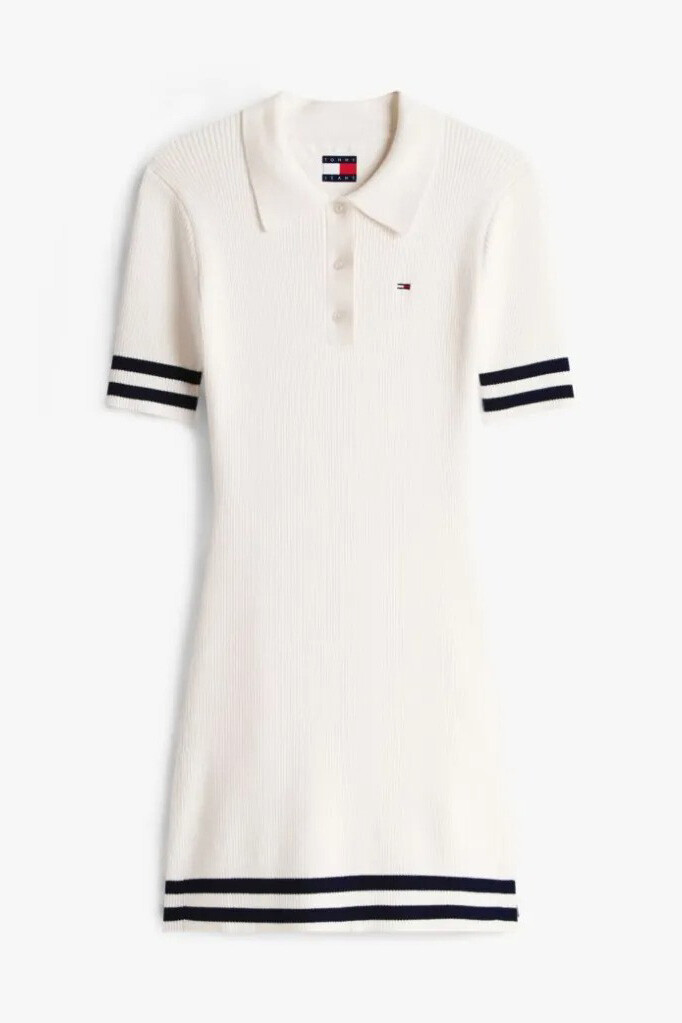 Pamuk ve polyamid karışımlı esnek dokusuyla vücut hatlarına nazikçe uyum sağlayan bu elbise, sportif tenisçi stilini feminen bir silüetle buluşturur. Bel kısmına kadar vücudu saran ve etek ucuna doğru hafifçe genişleyen Fit & Flare kesimi, hem dinamik bir görünüm sağlar hem de hareket özgürlüğünü destekler. Klasik düğmeli polo yakası ve kollar ile etek ucundaki kontrast renkli şerit detayları, sade tasarıma retro ve enerjik bir hava katar. Diz üstünde biten mini boyu ve esnek yapısı sayesinde gün boyu konforlu ve şık bir kullanım vadeder.