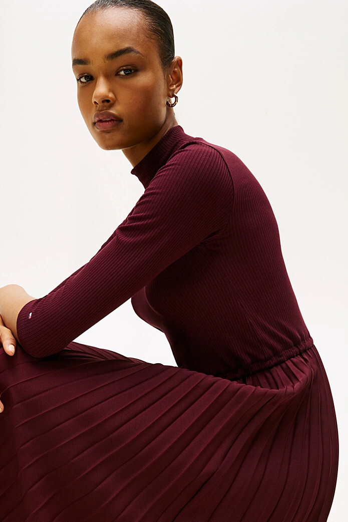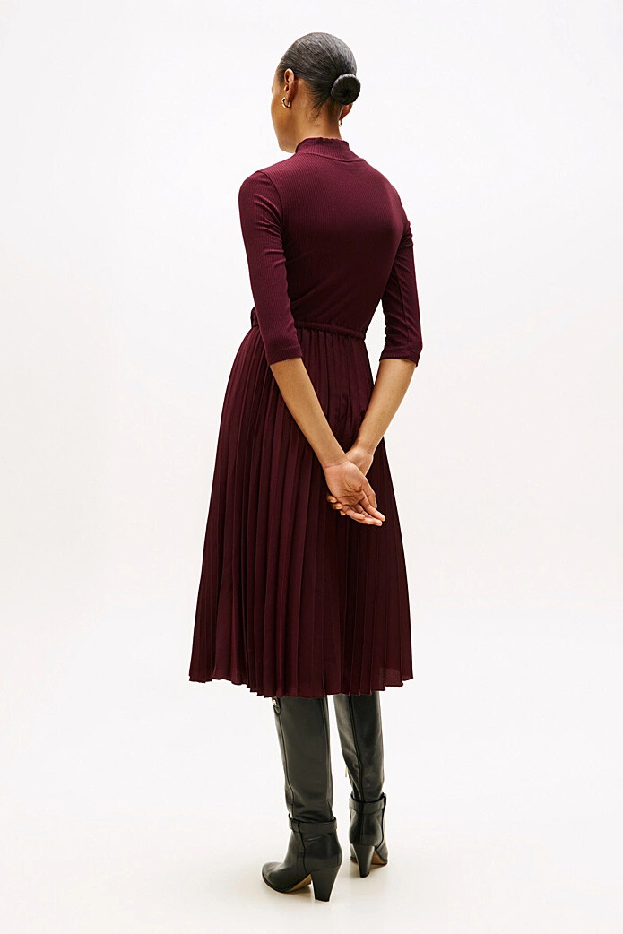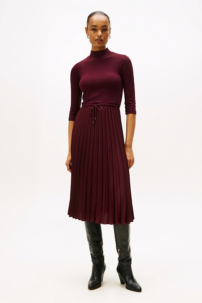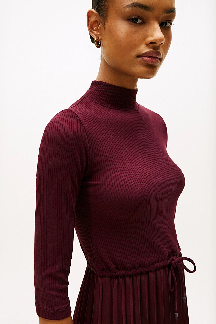 İki parçalı bir takımın şıklığını tek bir elbisenin konforuyla sunan bu tasarım, gardırobunuzun en zarif parçalarından biri olacak. Vücudu saran esnek ve fitilli triko üst kısım, balıkçı yakasıyla sofistike bir duruş sergilerken, belden aşağıya dökülen akıcı piliseli etek, her adımda zarafetinizi vurgular. Ayarlanabilir büzgülü beli, silüetinizi dilediğiniz gibi şekillendirmenize olanak tanır. Hem ofis şıklığı hem de özel davetler için topuklu ayakkabılarla veya günlük kullanım için spor ayakkabılarla kolayca kombinleyebilirsiniz.