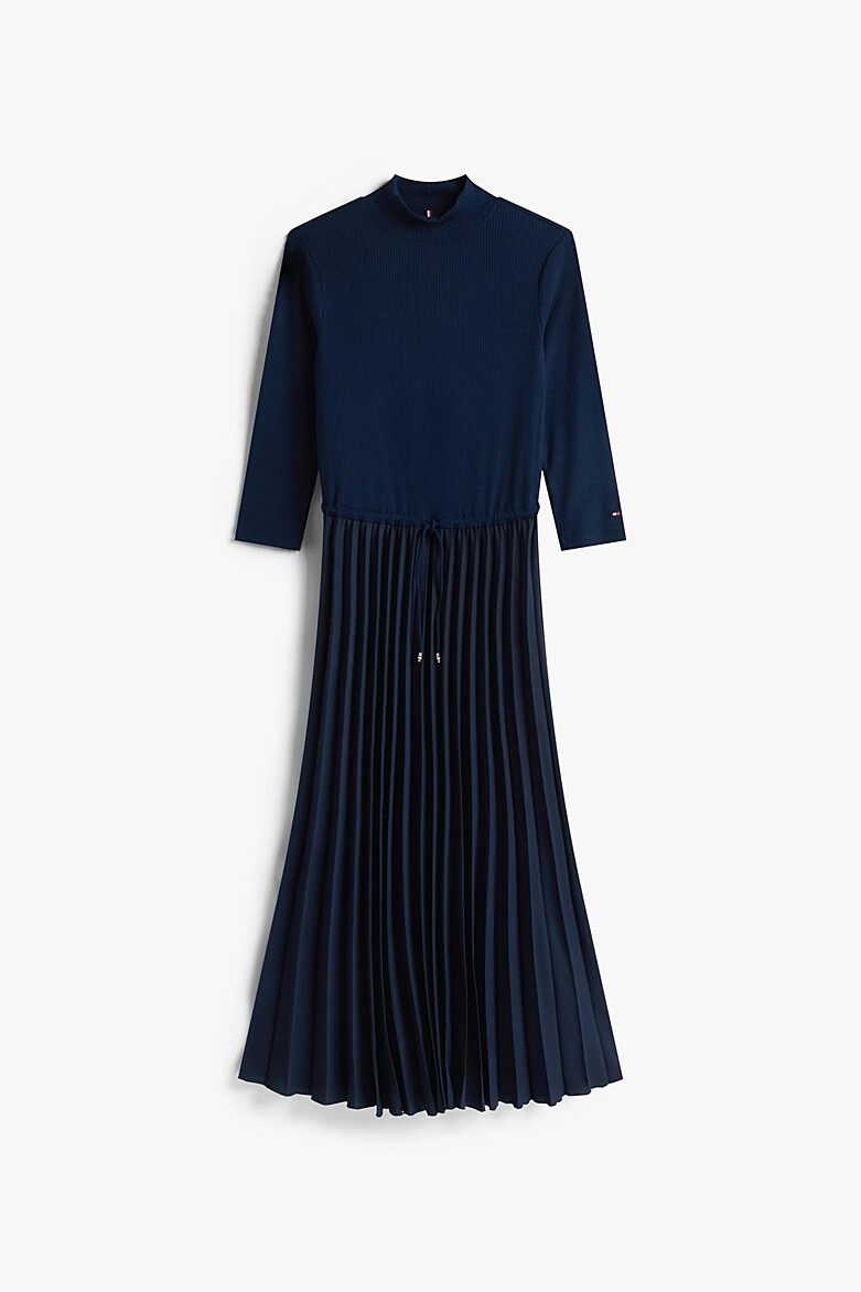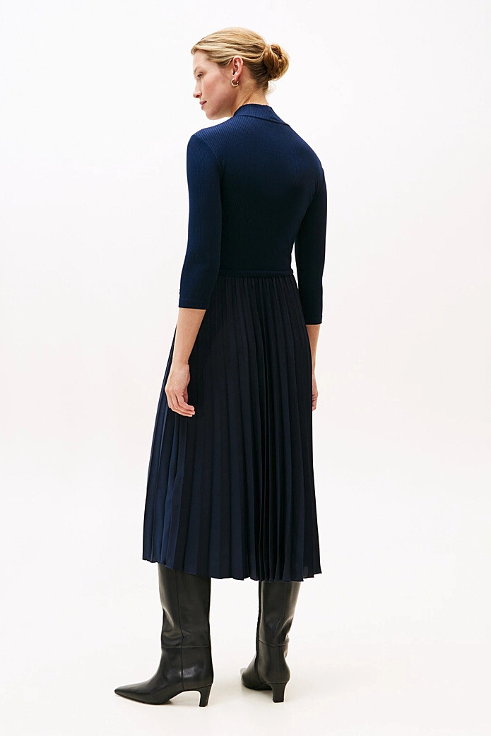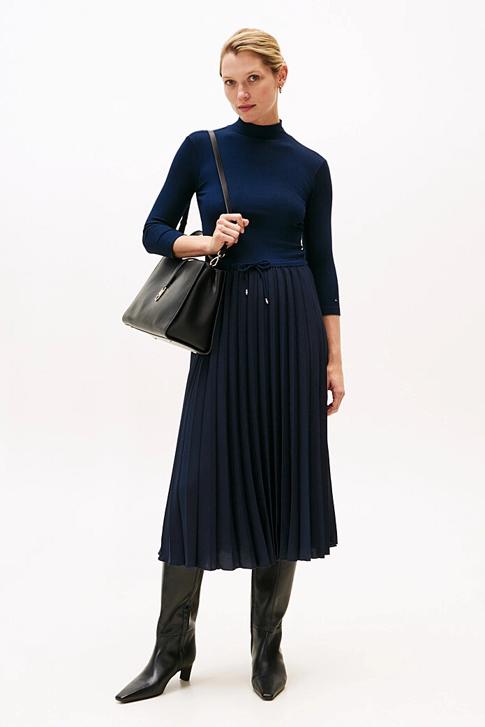 İki parçalı bir takımın şıklığını tek bir elbisenin konforuyla sunan bu tasarım, gardırobunuzun en zarif parçalarından biri olacak. Vücudu saran esnek ve fitilli triko üst kısım, balıkçı yakasıyla sofistike bir duruş sergilerken, belden aşağıya dökülen akıcı piliseli etek, her adımda zarafetinizi vurgular. Ayarlanabilir büzgülü beli, silüetinizi dilediğiniz gibi şekillendirmenize olanak tanır. Hem ofis şıklığı hem de özel davetler için topuklu ayakkabılarla veya günlük kullanım için spor ayakkabılarla kolayca kombinleyebilirsiniz.