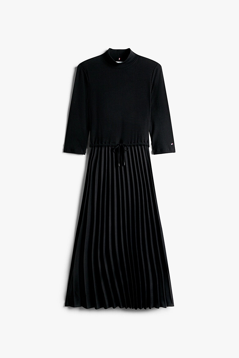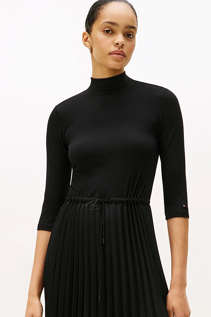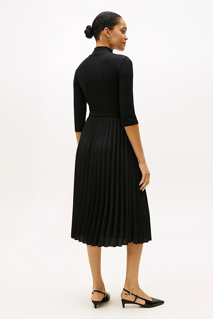 İki parçalı bir takımın şıklığını tek bir elbisenin konforuyla sunan bu tasarım, gardırobunuzun en zarif parçalarından biri olacak. Vücudu saran esnek ve fitilli triko üst kısım, balıkçı yakasıyla sofistike bir duruş sergilerken, belden aşağıya dökülen akıcı piliseli etek, her adımda zarafetinizi vurgular. Ayarlanabilir büzgülü beli, silüetinizi dilediğiniz gibi şekillendirmenize olanak tanır. Hem ofis şıklığı hem de özel davetler için topuklu ayakkabılarla veya günlük kullanım için spor ayakkabılarla kolayca kombinleyebilirsiniz.