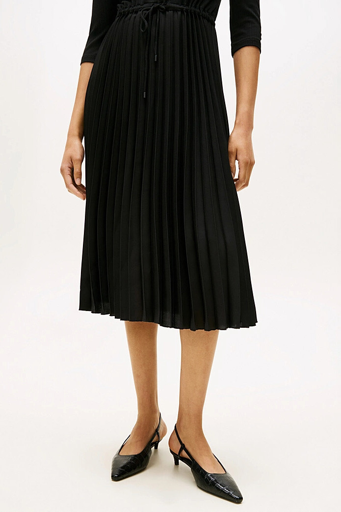 Kadın Fitilli Beli Büzgülü Eteği Piliseli Midi Elbise - Siyah