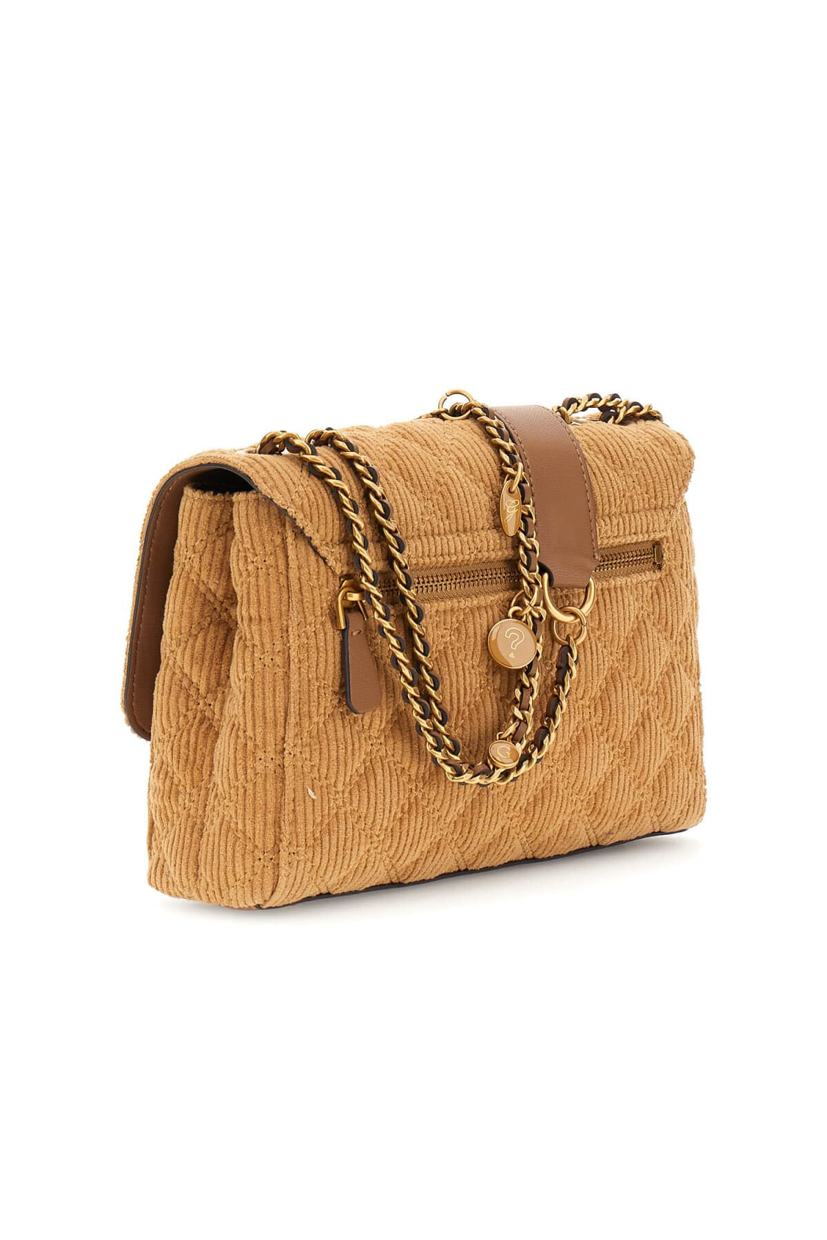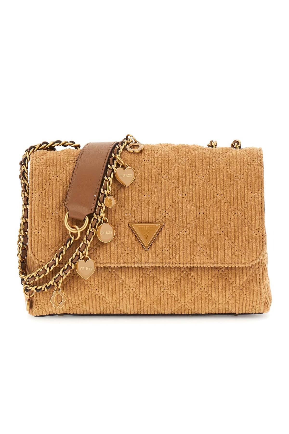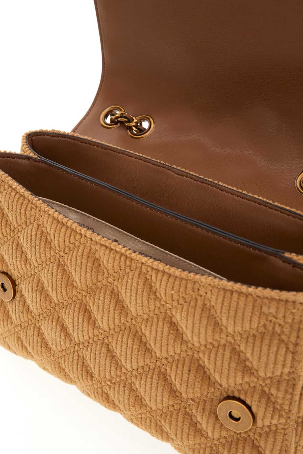 Dokulu ve zengin bir görünüme sahip bu omuz çantası, fitilli kadife kumaşıyla öne çıkar. Kumaş üzerine işlenmiş zarif kapitone dikişler, çantaya derinlik ve sofistike bir karakter kazandırır. Parlak zincir askısı ve askıya takılı dekoratif metal charm'lar, çantanın sıcak taba rengiyle modern bir kontrast yaratır. Çoklu bölmeli iç tasarımı fonksiyonel bir kullanım sunarken, ön kapaktaki üçgen formlu metal aksesuar tasarıma imzasını atar.