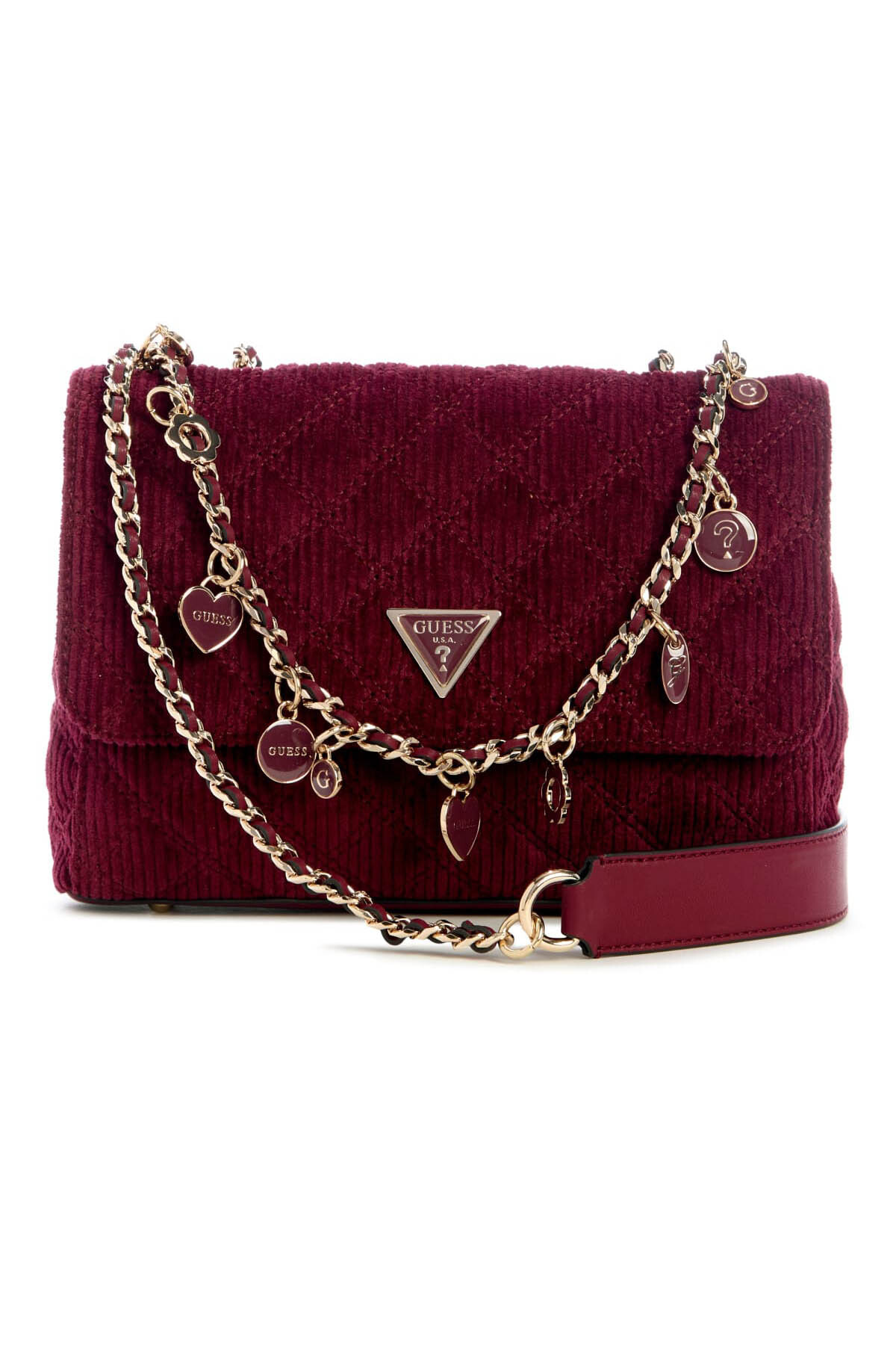 Zengin dokulu ve göz alıcı bir renge sahip bu omuz çantası, fitilli kadife kumaşıyla öne çıkar. Kumaş üzerine işlenmiş zarif kapitone dikişler, çantaya derinlik ve sofistike bir karakter kazandırır. Parlak zincir askısı ve askıya takılı dekoratif metal charm'lar, çantanın derin bordo rengiyle modern bir kontrast yaratır. Çoklu bölmeli iç tasarımı fonksiyonel bir kullanım sunarken, ön kapaktaki üçgen formlu metal aksesuar tasarıma imzasını atar.