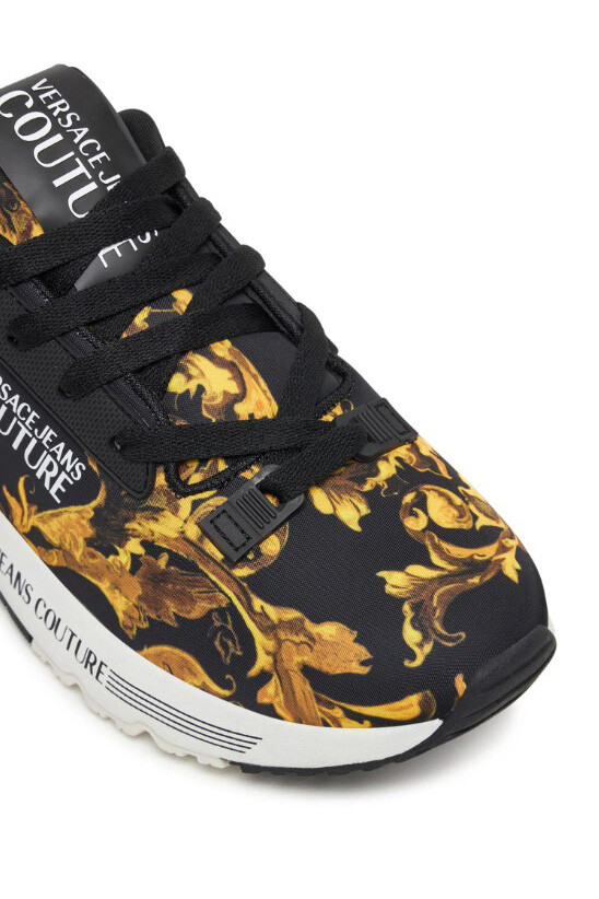 Sportif silüeti lüks detaylarla buluşturan bu sneaker, adımlarınıza göz alıcı bir stil katacak. Siyah kauçuksu ve poliüretan detayların, markanın ikonik altın sarısı barok desenli naylon kumaşıyla birleştiği bu ayakkabı, dinamik ve sofistikke bir estetik sunuyor. Yan kısmındaki, taban kenarındaki ve topuktaki yazı logoları, tasarıma markanın imzasını atıyor. Phylon, TPR ve TPU karışımından oluşan tabanı, gün boyu konfor ve dayanıklılık sağlarken, bağcıklı yapısı ayağınıza tam uyum sağlar. Günlük kombinlerinize lüks bir dokunuş katmak için mükemmel bir seçimdir.