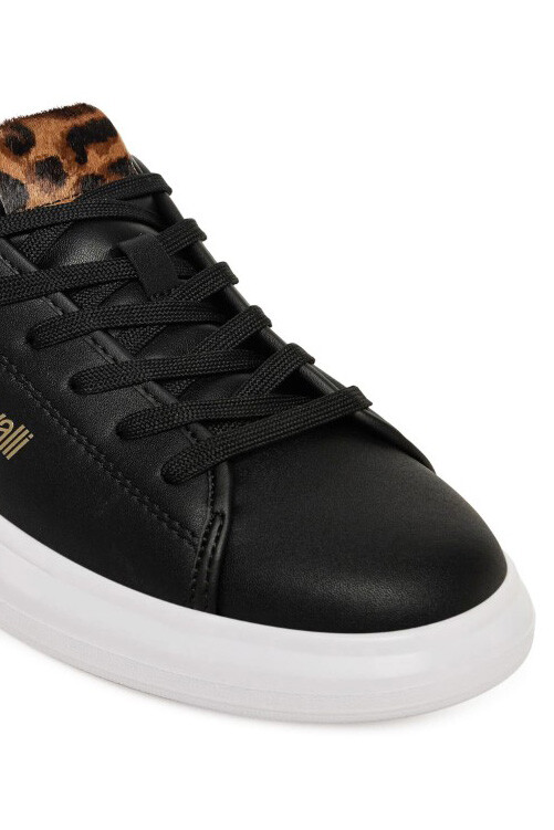 Klasik siyah sneaker silüetine vahşi ve şık bir dokunuş katan bu ayakkabı ile stilinizi bir üst seviyeye taşıyın. Pürüzsüz siyah yüzeyi, dil ve topuk kısmındaki göz alıcı leopar deseniyle cesur bir kontrast oluşturur. Yan kısmındaki altın rengi yazı logosu ve topuktaki dikey logo detayı tasarıma lüks bir imza katarken, kalın beyaz Phylon tabanı hem güncel bir görünüm sunar hem de gün boyu üstün konfor sağlar. Deri ve poliüretan karışımı malzemesiyle kalite vadeden bu bağcıklı sneaker, gardırobunuzdaki her parçayla zahmetsizce uyum sağlayarak stil sahibi duruşunuzu tamamlayacak.