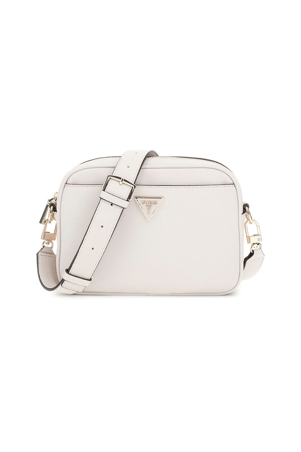 Günlük kullanım için ideal olan bu çapraz askılı çanta, minimalist ve fonksiyonel "kamera çantası" tasarımıyla öne çıkar. Dokulu kırık beyaz yüzeyi ve sade silüeti, çantaya zamansız bir hava katar. Konforlu bir taşıma deneyimi sunan geniş ve ayarlanabilir omuz askısı, çantanın pratikliğini artırır. Ön yüzeydeki üçgen formlu metal aksesuar zarif bir detay sunarken, arka kısmındaki fermuarlı cep ek saklama alanı sağlar.