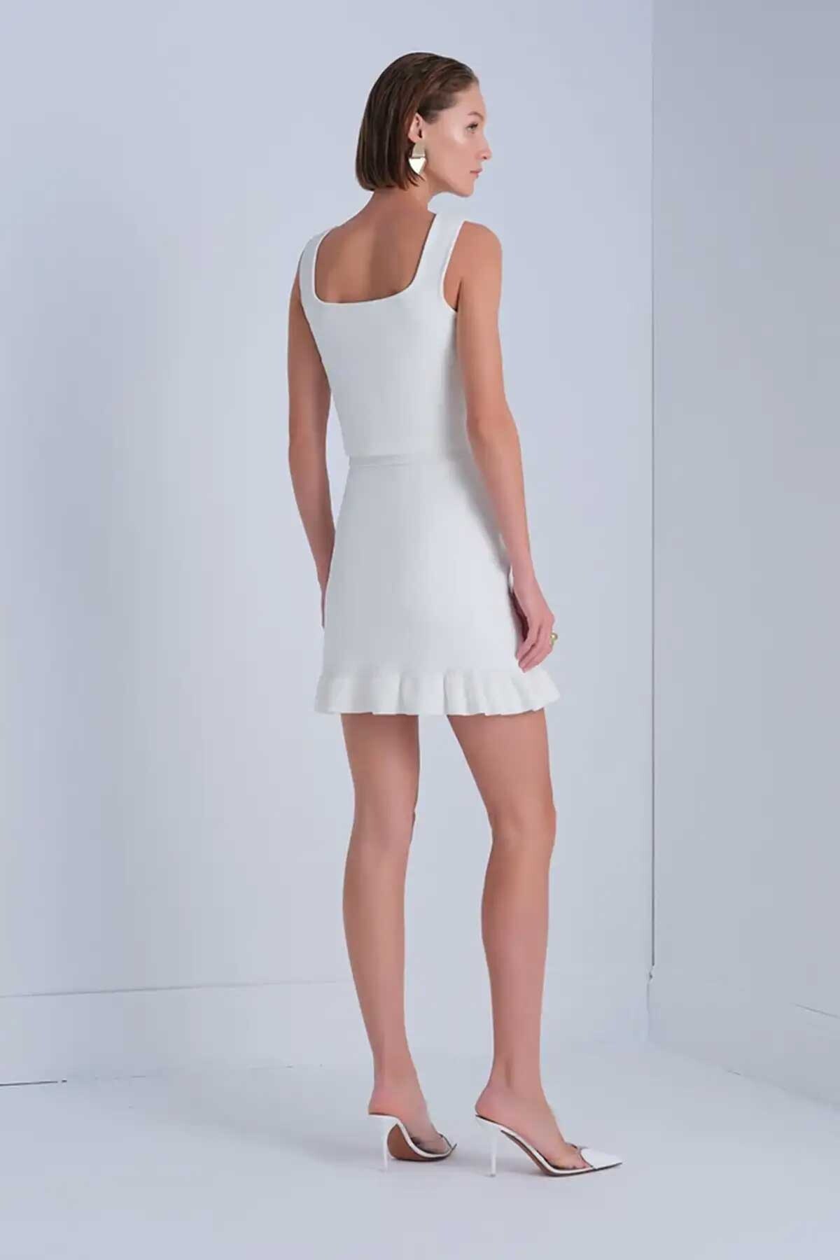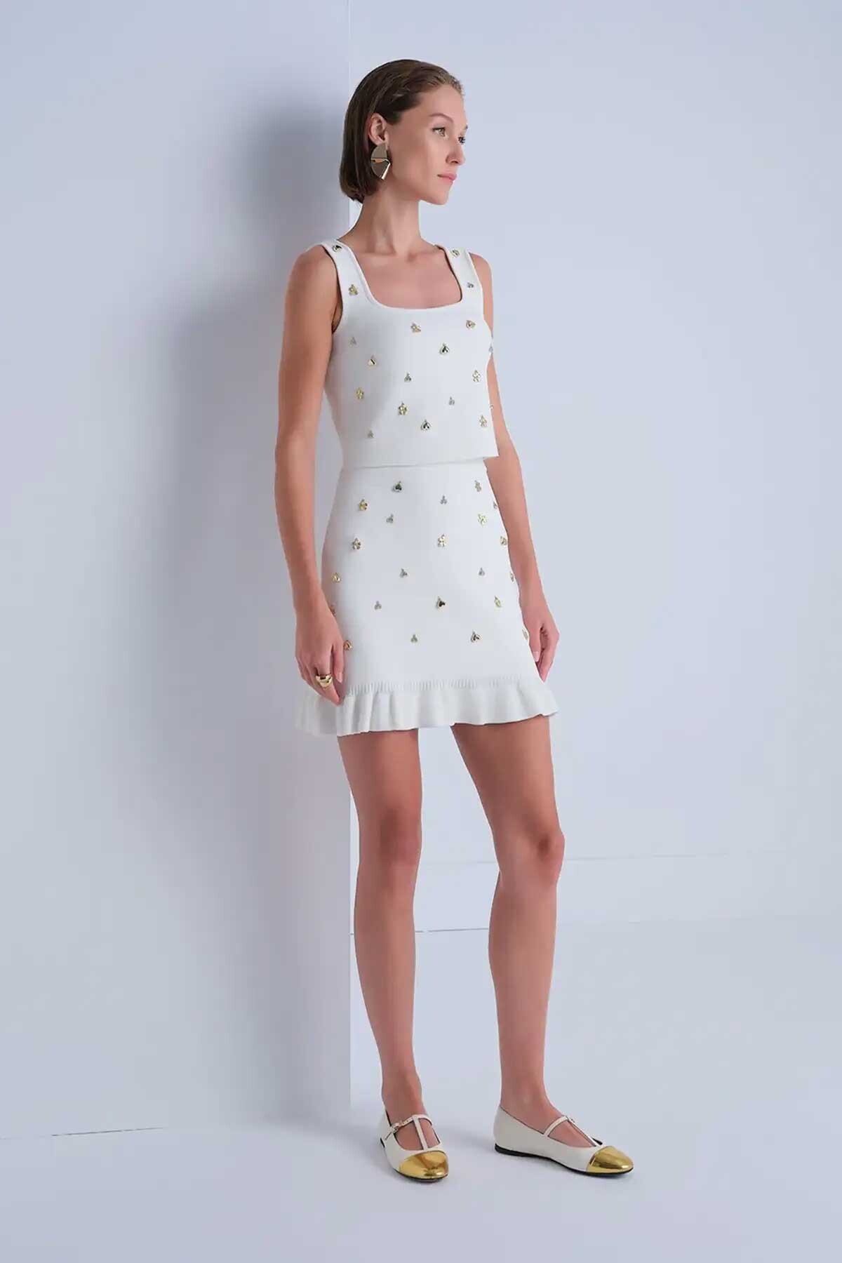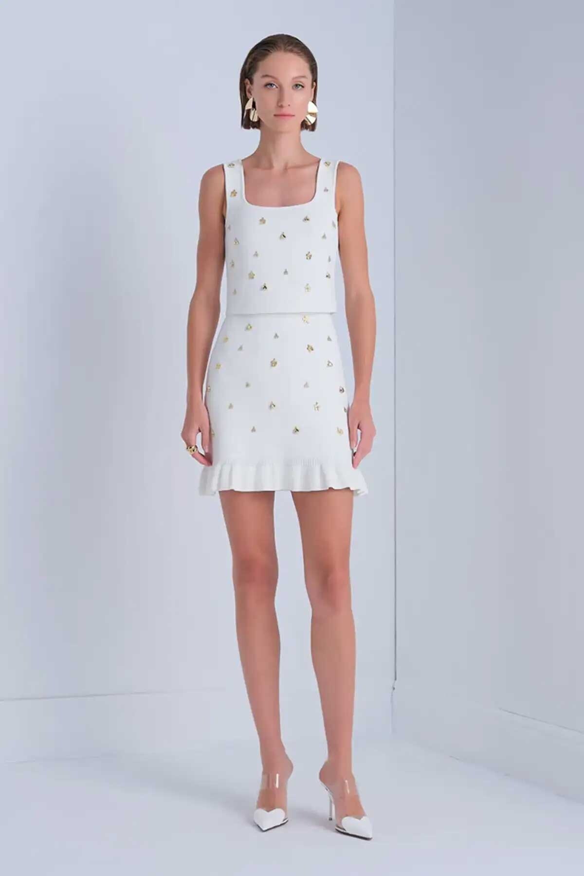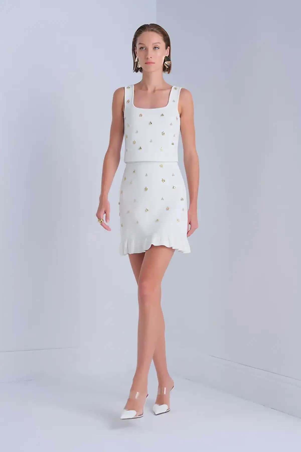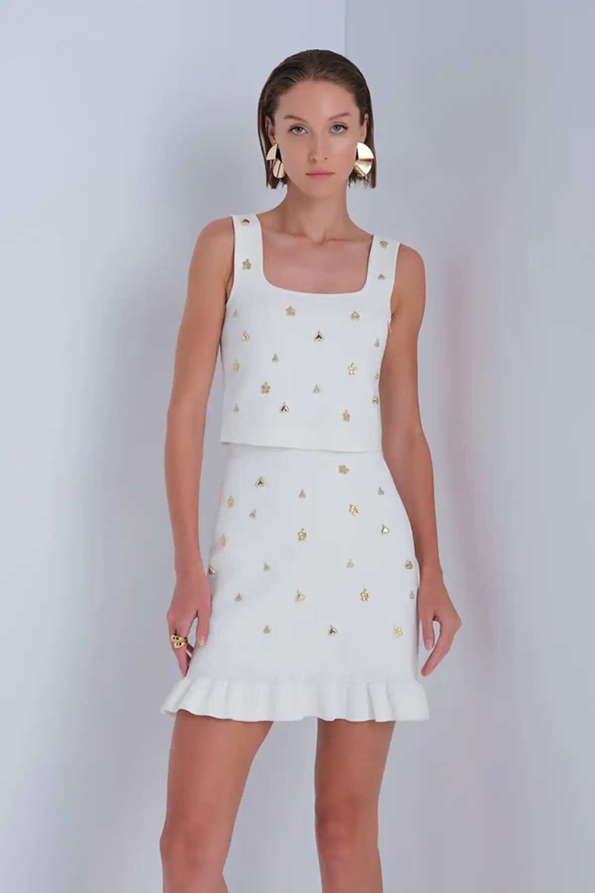 Kadın Gold Aksesuarlı Fırfırlı Mini Etek - Ekru