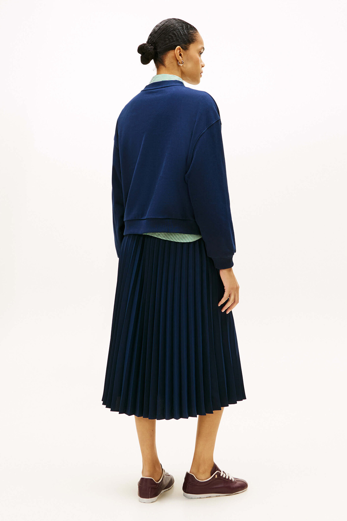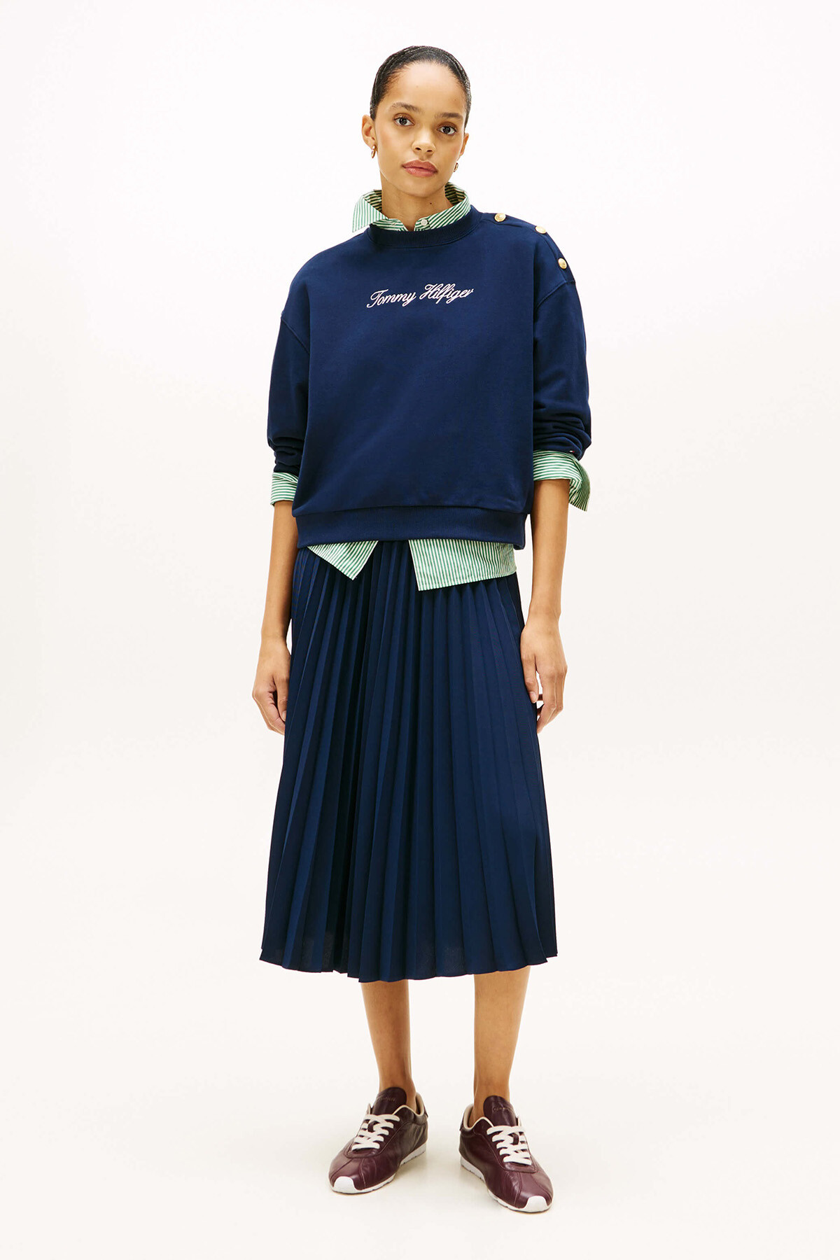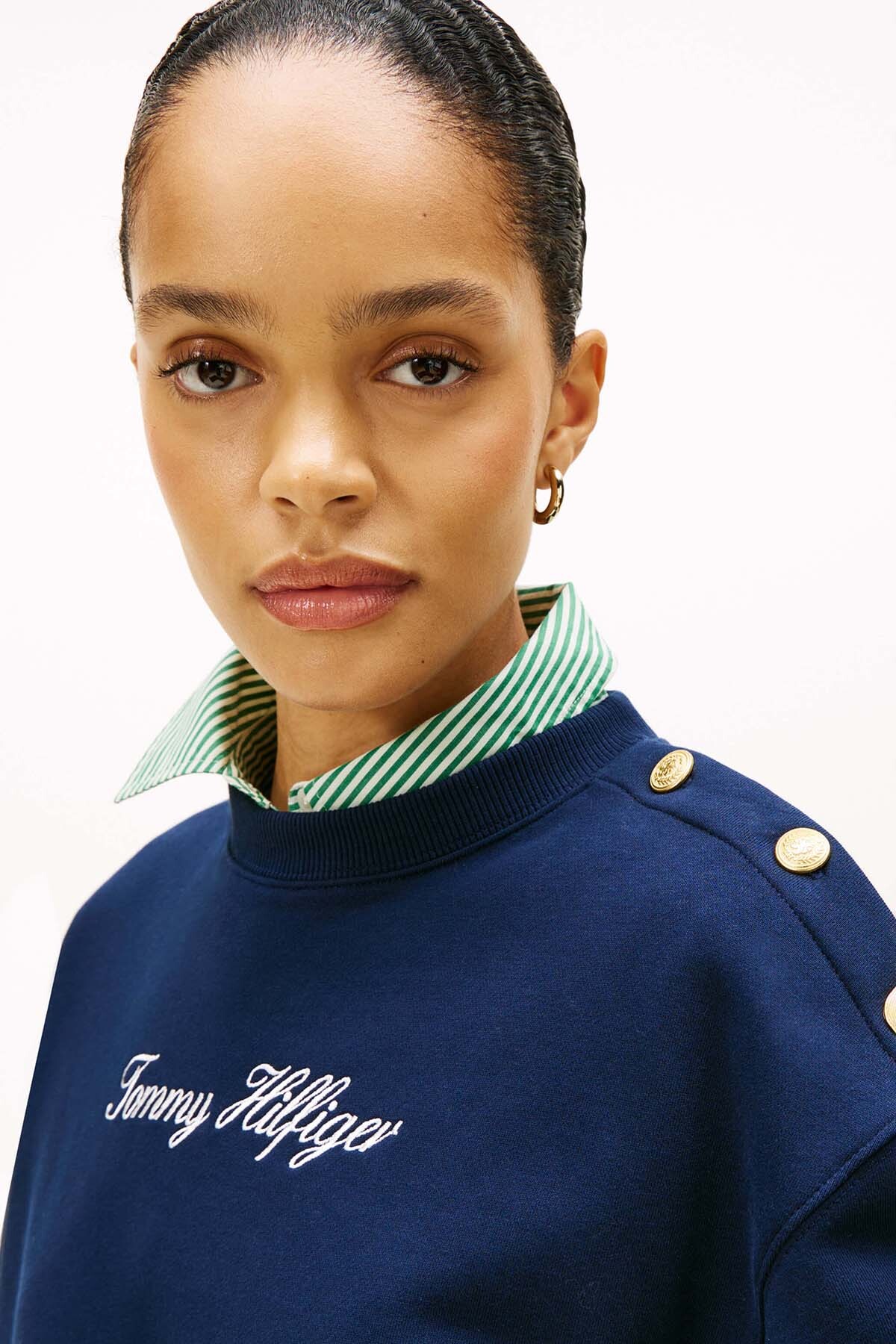 Denizci şıklığını modern sokak stiliyle birleştiren sweatshirt, derin ve asil lacivert tonuyla gardırobunuza zamansız bir parça ekliyor. Sol omuzdaki parlak altın rengi metal düğmeler, klasik bir tasarıma lüks ve ışıltılı bir dokunuş katarak onu sıradan bir sweatshirt'ten ayırıyor. %100 saf pamuktan üretilen terry kumaşı, cildinizde doğal ve yumuşak bir his bırakırken; göğüs kısmındaki beyaz el yazısı nakış logo, koyu zemin üzerinde zarif bir kontrast yaratıyor. Düşük omuzlu rahat kesimi ve esnek yapısı sayesinde gün boyu konforlu bir kullanım sunuyor.