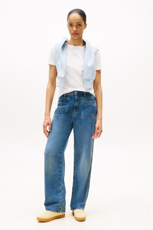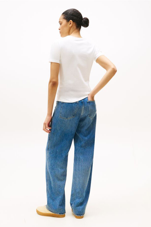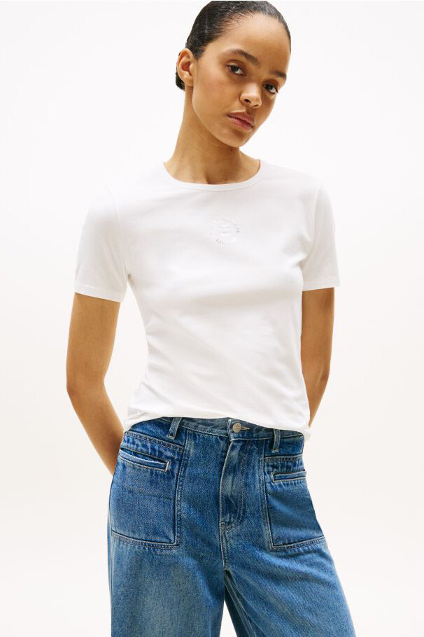 Her gardırobun temel parçası olan beyaz t-shirt, zarif bir detayla yenileniyor. Yüksek oranda pamuk içeren esnek kumaşı, vücudu saran yapısıyla hem şık bir görünüm sunar hem de gün boyu konfor sağlar. Klasik bisiklet yaka tasarımı, göğüs kısmında yer alan ve aynı tonlarda (tonal) işlenmiş dairesel grafik baskı ile tamamlanır. Bu incelikli detay, minimalist ve modern bir dokunuş yaratır.