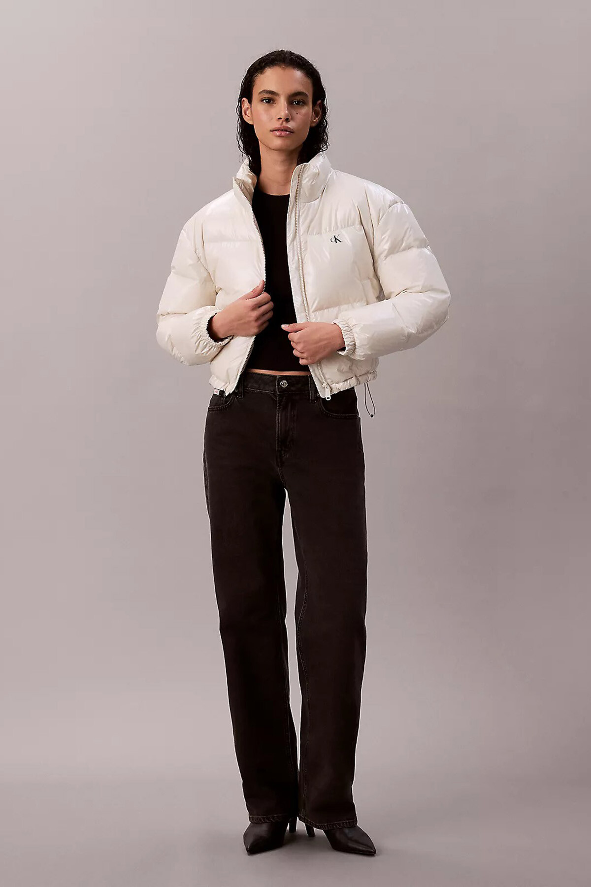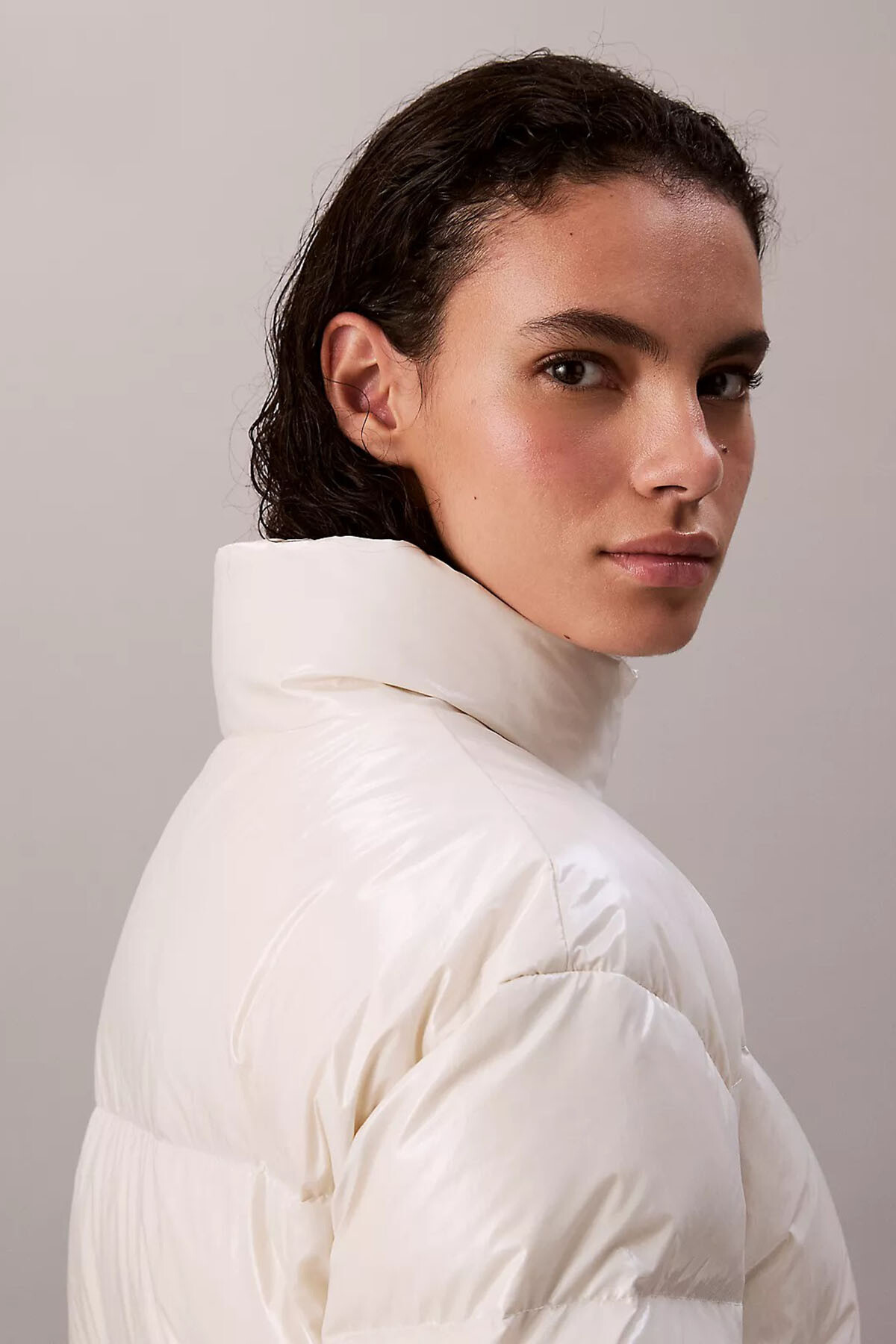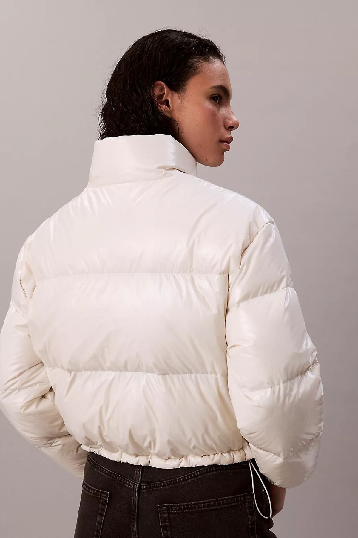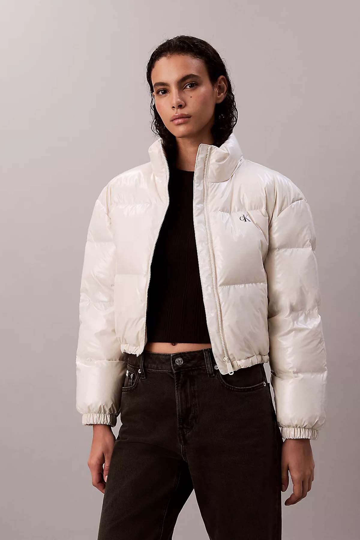 Kış kombinlerinize aydınlık ve modern bir dokunuş katan bu ekru şişme mont, "High-Shine" parlak yüzey dokusuyla dikkat çeker. Kısa (crop) kesimi, yüksek belli jeanler ve eteklerle mükemmel bir uyum yakalayarak bacak boyunuzu olduğundan daha uzun gösteren şık bir siluet oluşturur. Vücut ısısını etkili bir şekilde hapseden dolgulu yapısı soğuk havalarda sizi sıcak tutar. Boynu saran dik yakası ve elastik manşetleri rüzgarı engeller. Göğüs kısmındaki minimalist logo detayı ve fermuarlı cepleriyle hem şık hem de fonksiyonel bir kullanım sunan, gardırobunuzun yıldız parçası olmaya adaydır.