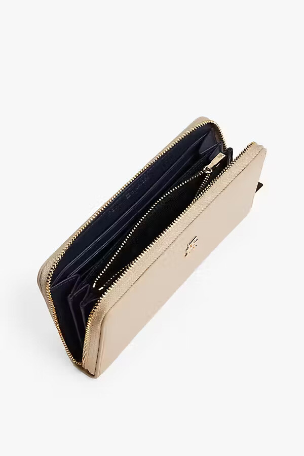 Sade şıklığı ve fonksiyonelliği bir arada sunan bu cüzdan, stil sahibi kadınların vazgeçilmezi olmaya aday. Pürüzsüz yüzeyi ve ön kısmında yer alan parlak metalik logo detayı ile sofistike bir görünüm sergiler. Çepeçevre fermuarlı kapanışı, eşyalarınız için üst düzey güvenlik sağlarken; kartlıklar, kağıt para bölmeleri ve fermuarlı bozuk para gözünden oluşan geniş iç hacmi mükemmel bir organizasyon sunar.