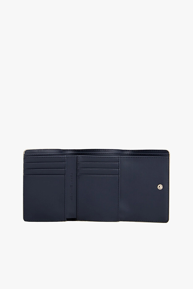 Kompakt tasarımı ve şık detaylarıyla bu cüzdan, günlük kullanım için ideal bir organizasyon sunar. Üç katlı yapısı, çok sayıda kart bölmesiyle tüm kartlarınızı düzenli bir şekilde saklamanıza olanak tanır. Ön kapak üzerindeki parlak metal monogram logosu, tasarıma sofistike ve ikonik bir imza atar. Çıtçıtlı kapanışı, eşyalarınız için güvenli bir saklama sağlar.