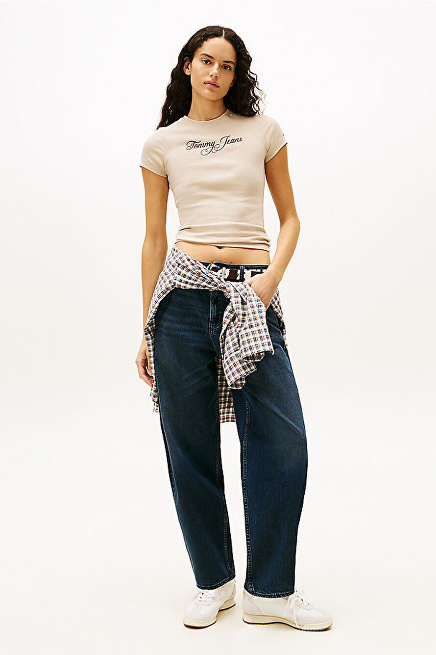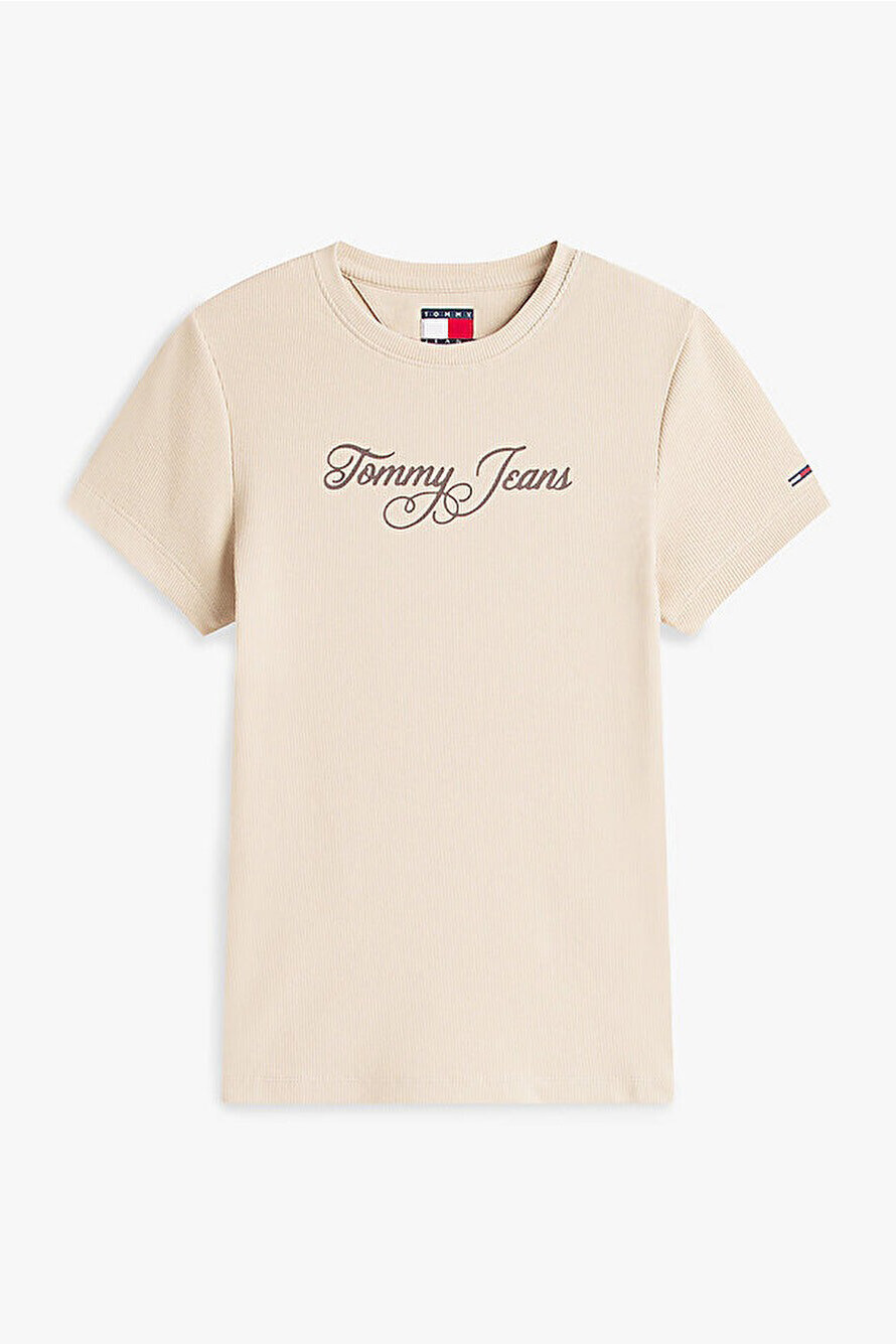 %95 pamuk ve elastan karışımlı yumuşak dokusuyla teninize nazikçe uyum sağlayan bu tişört, gün boyu süren konforu zarif bir estetikle buluşturur. Göğüs kısmında yer alan el yazısı stilindeki kahverengi tipografik logo, açık renkli zemin üzerinde sofistike bir kontrast oluşturarak minimalist tasarıma şık bir imza atar. Vücudu nazikçe saran slim kalıbı ve fitilli yapısı, modern ve feminen bir silüet yaratırken; klasik bisiklet yaka kesimi her türlü kombinle zahmetsizce uyum sağlar. Bel hizasında biten ideal boyu sayesinde, hem yüksek belli koyu denimlerle hem de ekose gömleklerle katmanlı stillerde mükemmel bir denge sunar.