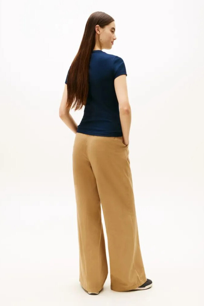 %95 pamuk ve elastan karışımlı dokusuyla teninize nazikçe uyum sağlayan bu tişört, gün boyu süren konforu zarif bir estetikle buluşturur. Göğüs kısmında yer alan el yazısı stilindeki tipografik logo, sade ve koyu renkli zemine nostaljik bir hava katarak minimalist tasarıma şık bir imza atar. Vücudu nazikçe saran slim kalıbı ve fitilli yapısı, modern bir silüet oluştururken; klasik bisiklet yaka kesimi her türlü kombinle zahmetsizce uyum sağlar. Bel hizasında biten ideal boyu sayesinde, hem yüksek belli pantolonlarla tek başına hem de katmanlı giyimde ceket veya gömlek içlerine/üstüne giymek için mükemmel bir temel parçadır.