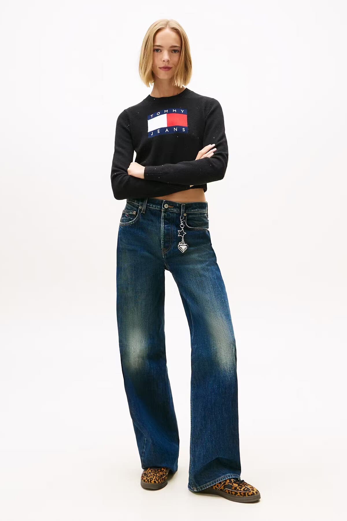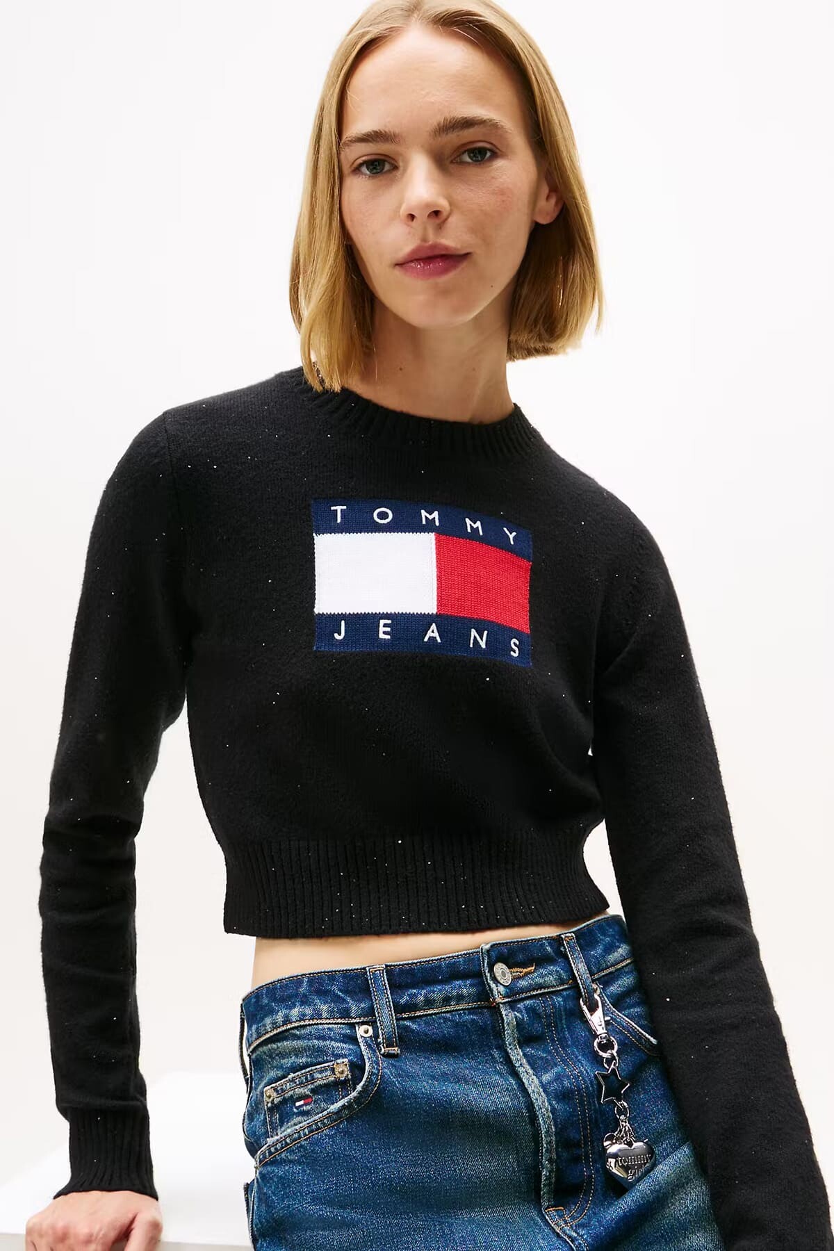 Pamuk karışımlı yumuşak dokusu ve kumaşına işlenen zarif ışıltılarıyla dikkat çeken bu siyah triko kazak, sokak stiline enerjik ve modern bir dokunuş katar. Göğüs kısmında yer alan büyük boyutlu ikonik logo detayı, tasarıma güçlü bir karakter kazandırır. Vücudu saran esnek yapısı ve kısa (crop) kesimi, özellikle yüksek belli jean pantolonlar ve eteklerle kusursuz bir uyum sağlar. Hem gündüz şıklığında hem de akşam davetlerinde parlamanızı sağlayacak keyifli bir parçadır.