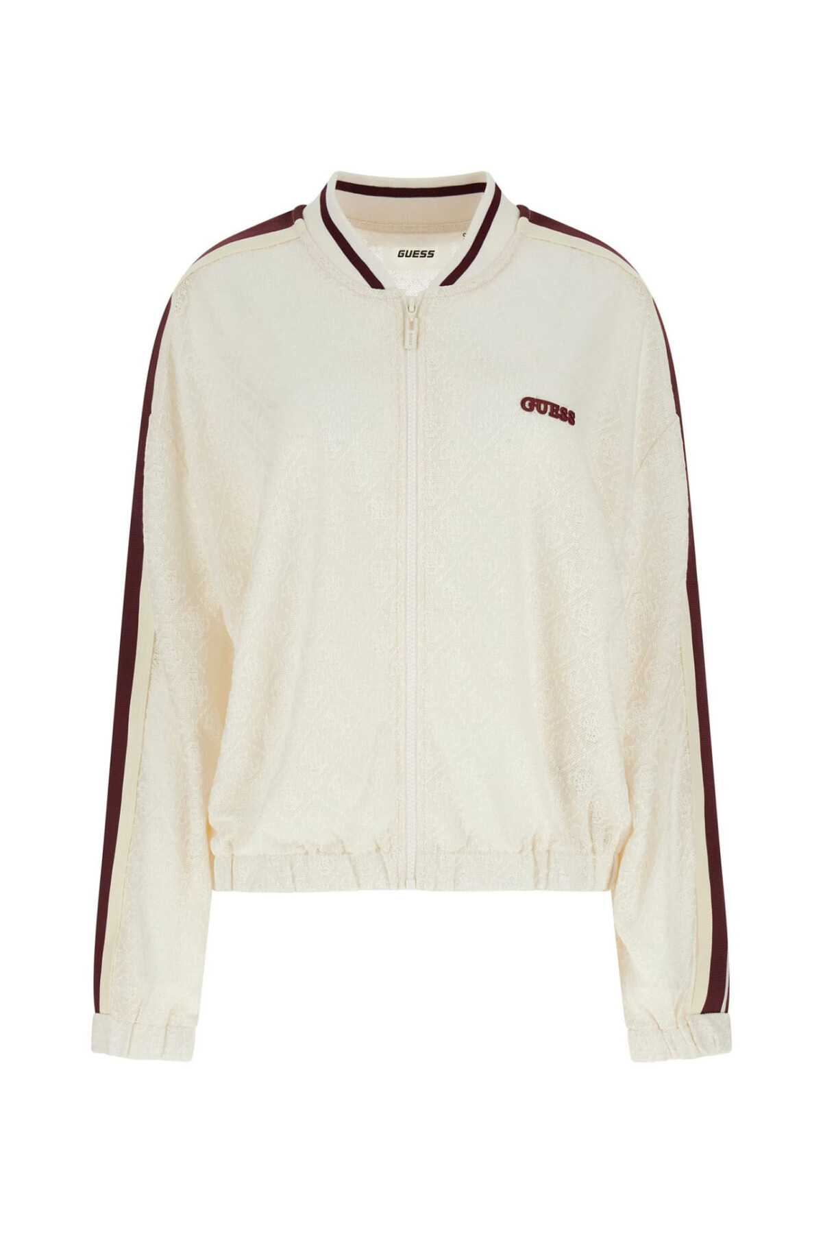 Detay: Göğüste marka logosu, kol şeritleri, jakarlı desenli doku