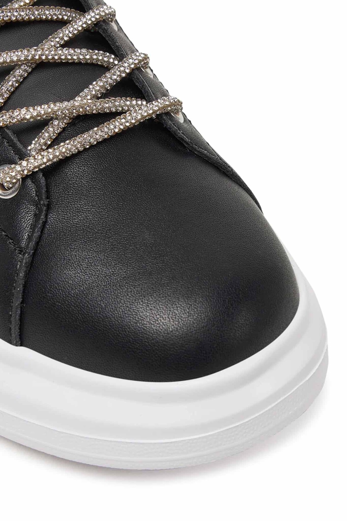 Bağcık: Siyah, metal halka detaylı bağcık sistemi