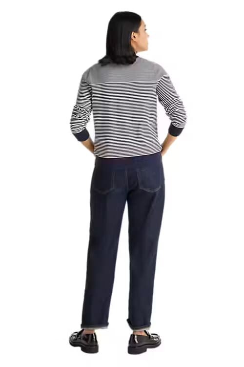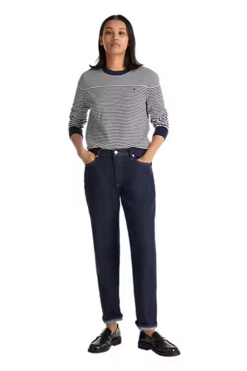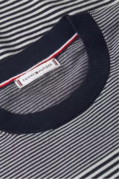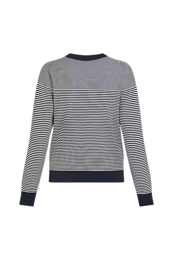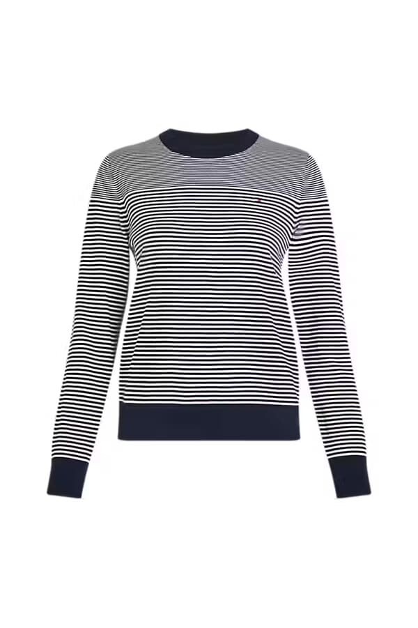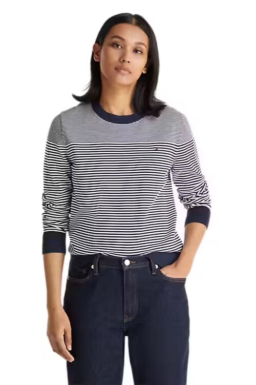 Marin stilinin zamansız ve şık temsilcisi olan bu çizgili triko kazak, gardırobunuzun en çok yönlü parçalarından biri olacak. Pamuk karışımlı, yumuşak ve esnek triko kumaşı, gün boyu konforlu bir kullanım sunar. İnce lacivert-beyaz çizgileri klasik ve zarif bir görünüm yaratırken, bisiklet yaka kesimi ve tam kalıbı modern bir silüet oluşturur. Manşetler ve etek ucundaki düz renk nervürlü detaylar, tasarıma şık bir bitiş kazandırır.
