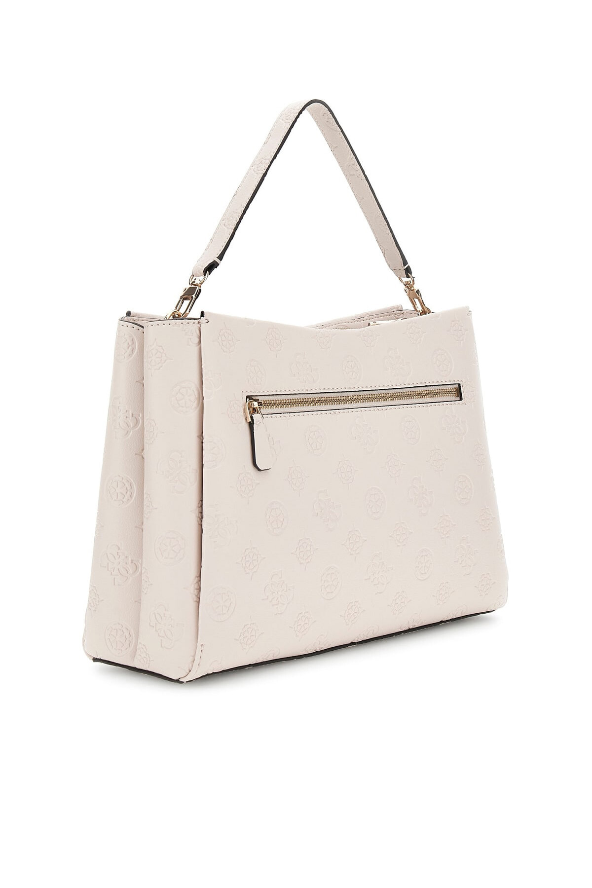 Yumuşak ve zarif bir silüete sahip bu el çantası, tüm yüzeyini kaplayan sofistike kabartma monogram deseni ile öne çıkar. Geniş iç hacmi ve konforlu askısı, günlük kullanım için ideal bir yapı sunar. Ön yüzeydeki üçgen formlu metal aksesuar, çantanın şık tasarımını tamamlarken, arka yüzeydeki fermuarlı cep pratik bir kullanım sağlar.