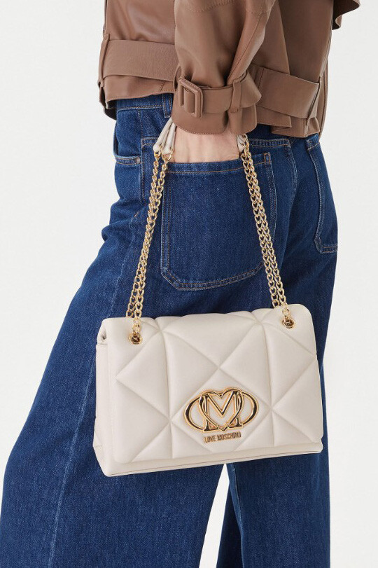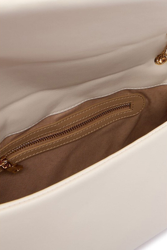Zarafeti ve modern tasarımı buluşturan bu omuz çantası, açık renk tonuyla kombinlerinize aydınlık ve sofistike bir dokunuş katar. Yumuşak dokulu poliüretan yüzeyi, geometrik kapitone dikiş detaylarıyla zenginleştirilerek boyutlu bir görünüm kazanmıştır. Ön kapakta yer alan büyük ve parlak altın rengi, kalp detaylı metal aksesuar, tasarıma lüks bir ışıltı kazandırır. Zincir ve suni deri kombinasyonlu askısı hem şıklık hem de konfor sunarken, ideal boyutlarıyla gündüzden geceye geçişte stilinizin tamamlayıcısı olur.
