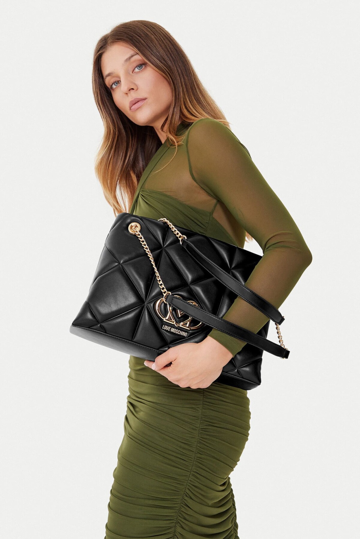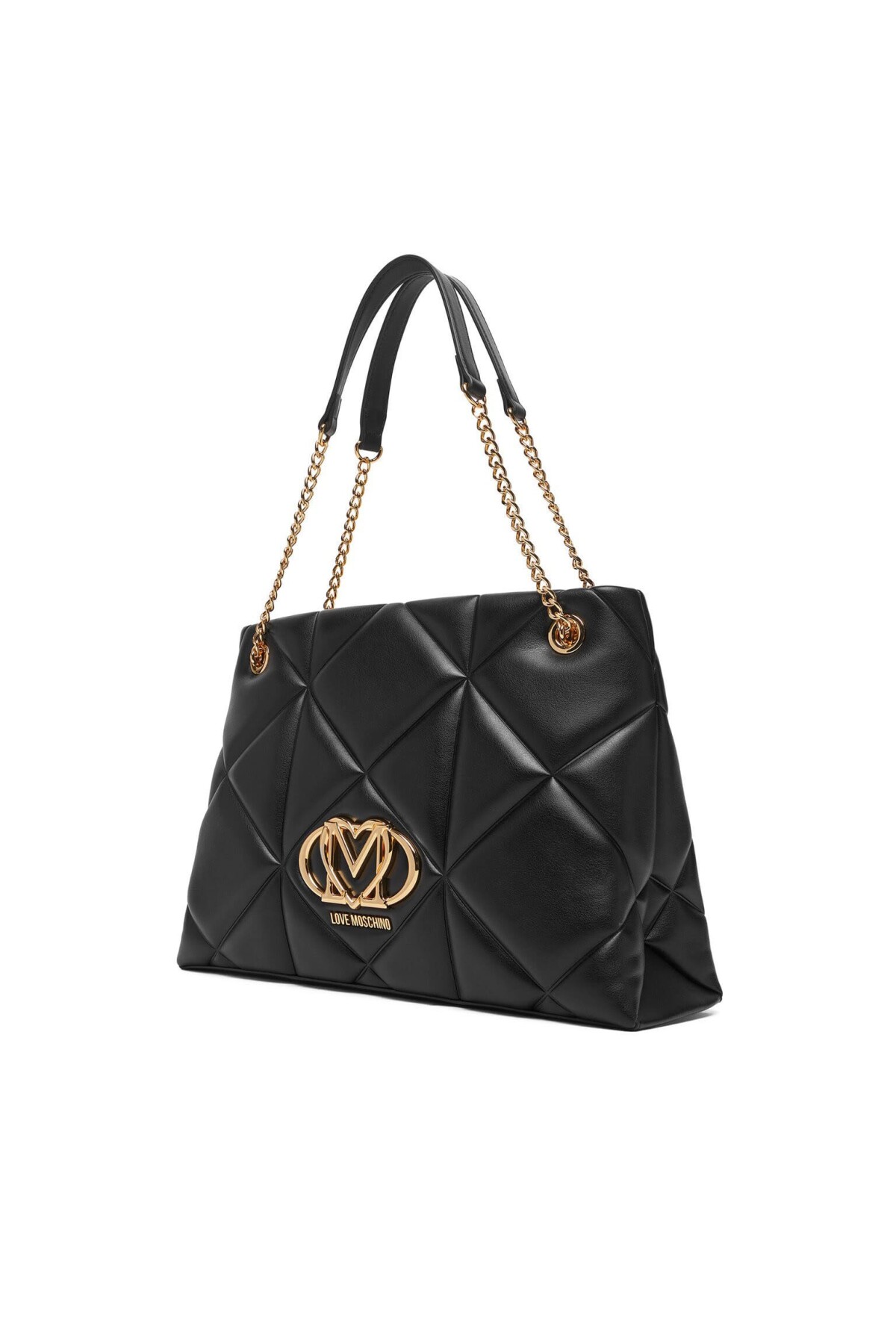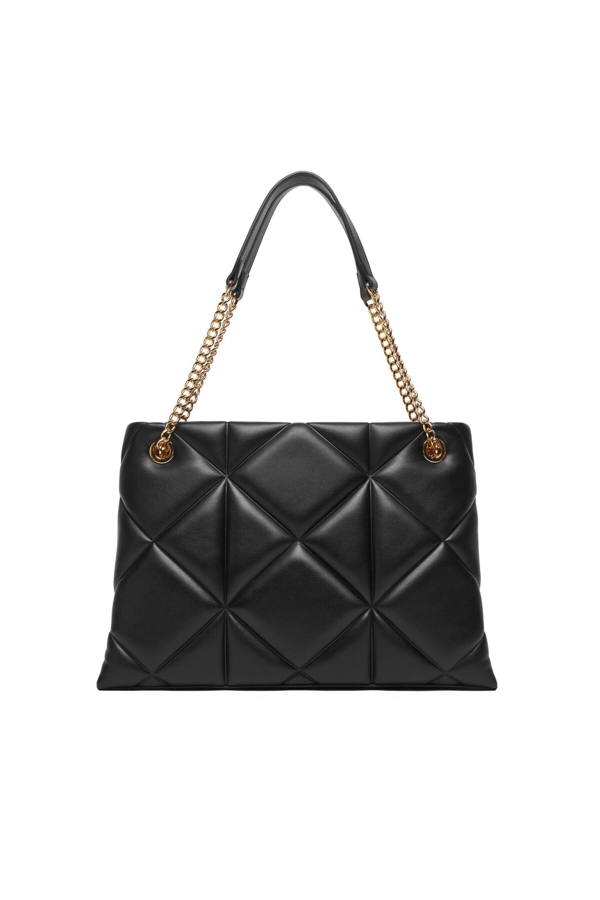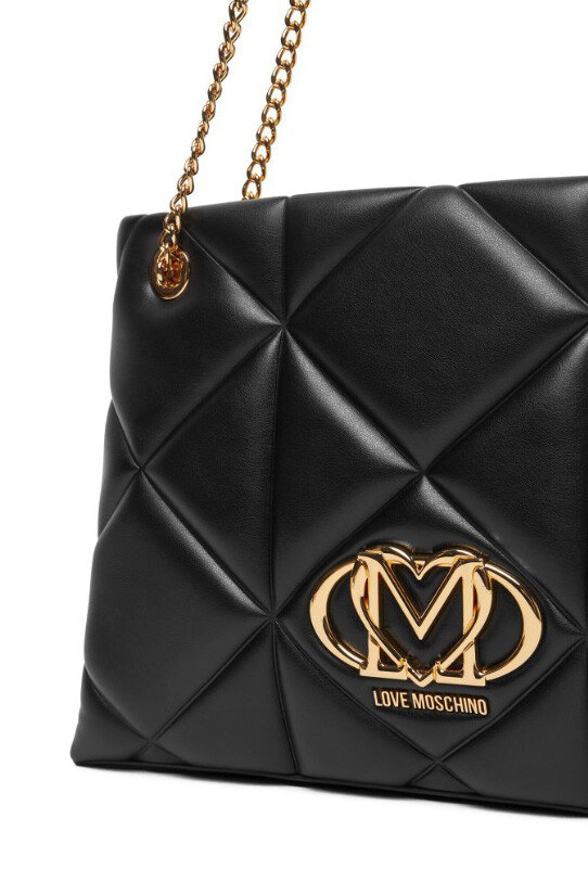 Geometrik kapitone dikişleri ve zarif duruşuyla dikkat çeken bu omuz çantası, şıklığı ve fonksiyonelliği bir arada sunuyor. Yumuşak dokulu poliüretan siyah yüzeyi, ön kısımda yer alan büyük ve parlak altın rengi, kalp detaylı metal amblem ile zenginleştirilmiştir. Zincir detaylı omuz askıları, konforlu bir kullanım için omuzluk kısmı ile desteklenmiştir. Geniş iç hacmi sayesinde günlük ihtiyaçlarınızı rahatça taşıyabileceğiniz bu parça, hem ofis hem de hafta sonu şıklığınızı tamamlar.