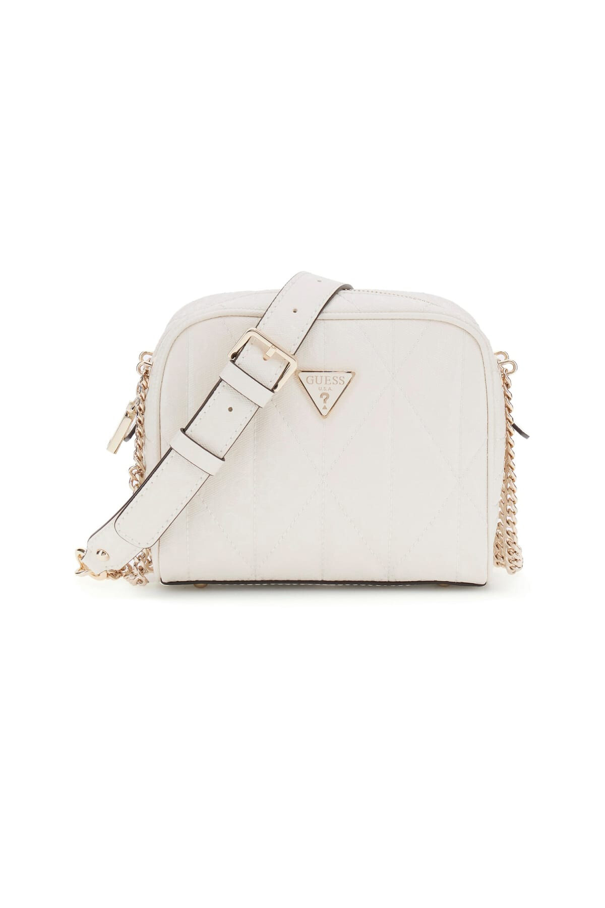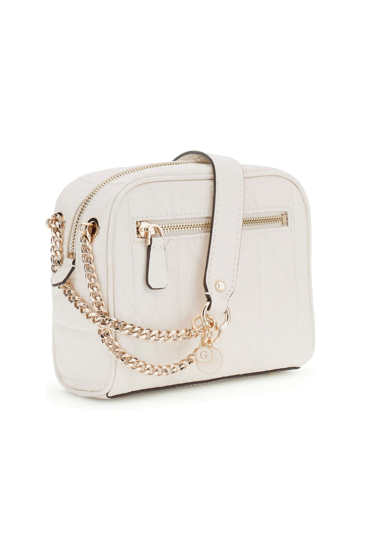Modern ve kompakt bir tasarıma sahip bu çapraz askılı çanta, popüler "kamera çantası" formundadır. Kırık beyaz rengindeki yüzeyi, kapitone dikişler ve içerisine işlenmiş kabartma monogram deseni ile zenginleştirilerek özgün bir doku sunar. Ayarlanabilir omuz askısındaki zincir detayı ve ön yüzündeki üçgen formlu metal aksesuar, çantanın zarif çizgilerini tamamlar. Fermuarlı ana bölmesi ve arka yüzeyindeki ek fermuarlı cebi ile fonksiyonel bir kullanım sağlar.
