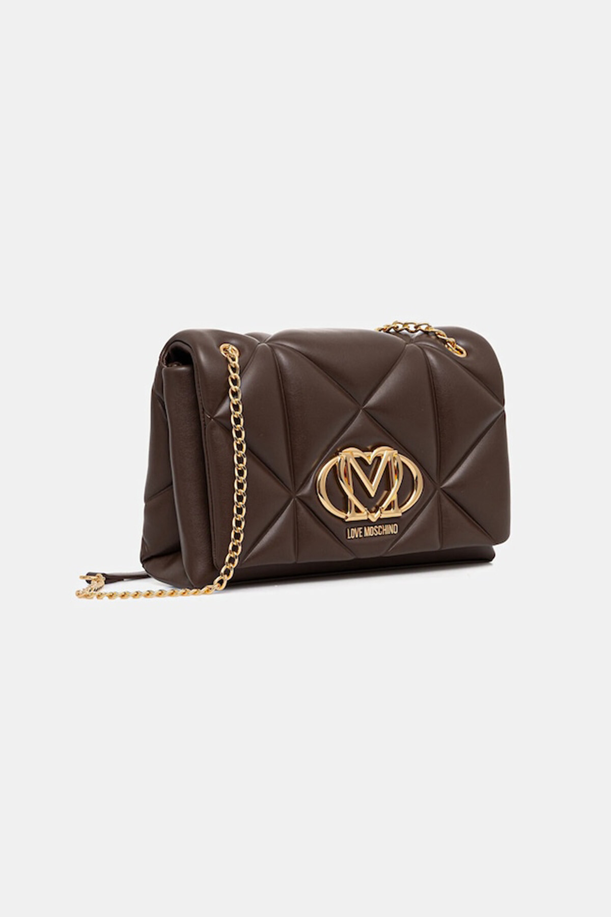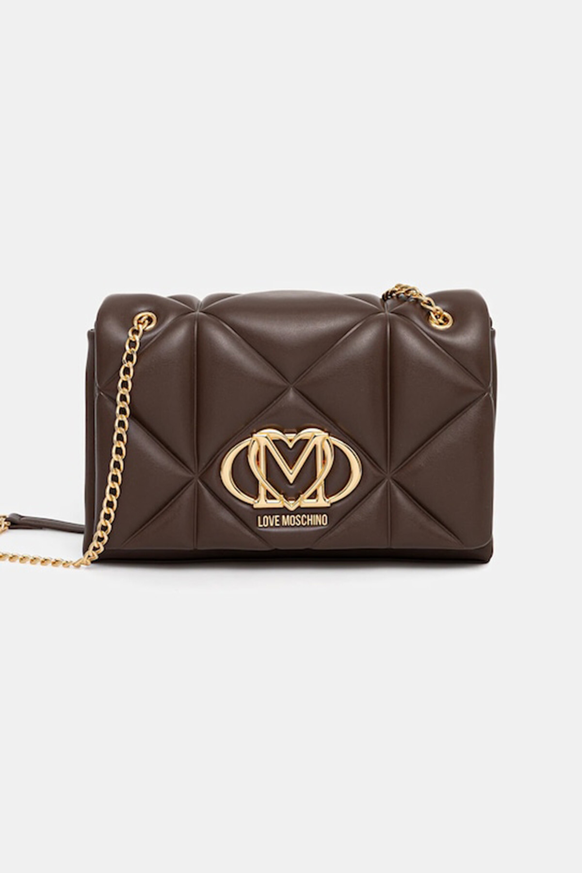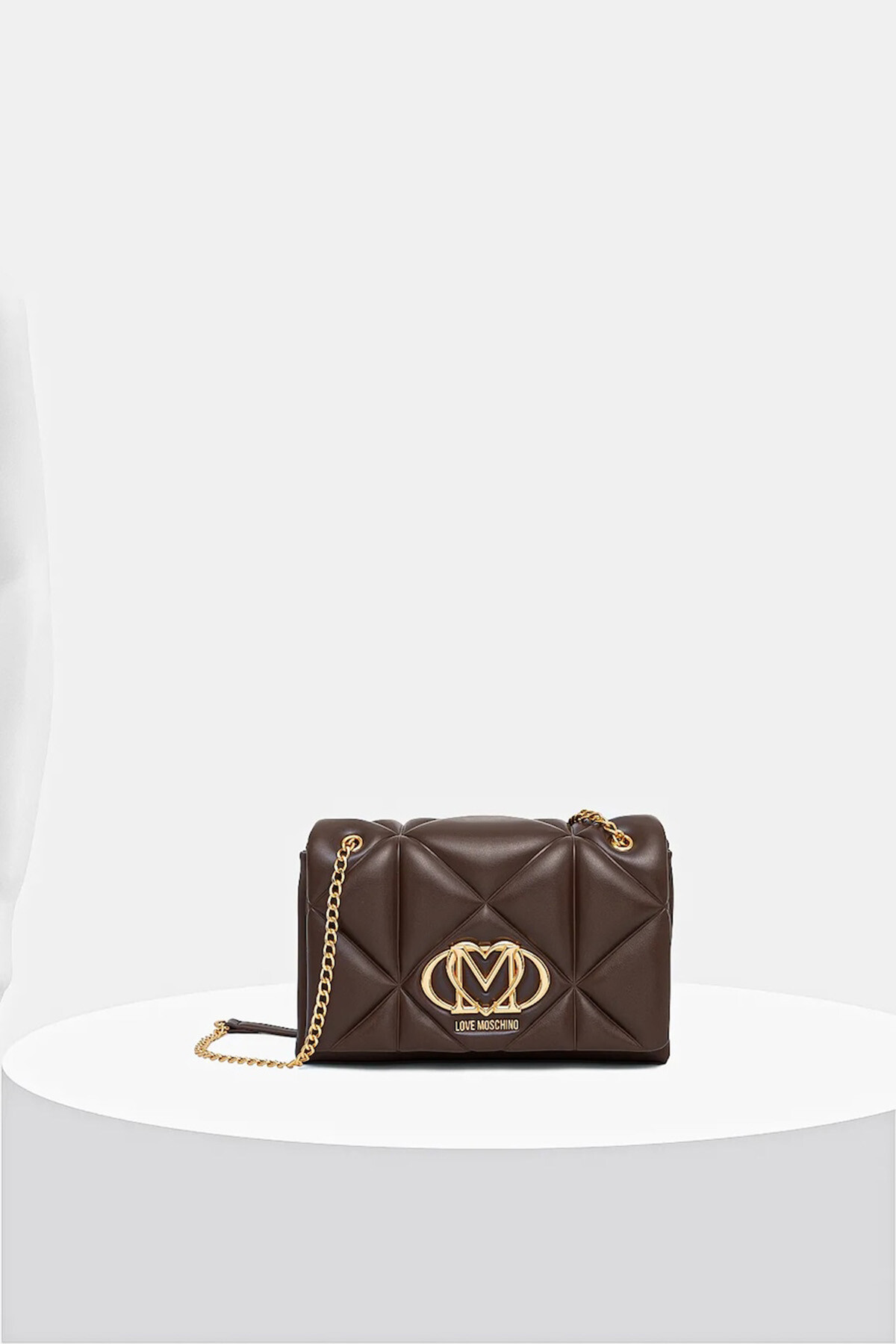 Kadın Omuz Çantası / Kapitone Logo DetaLove Moschino’nun kahverengi omuz çantası, kapitone yüzey tasarımı ve ön bölümdeki büyük gold metal logo ile dikkat çeker.