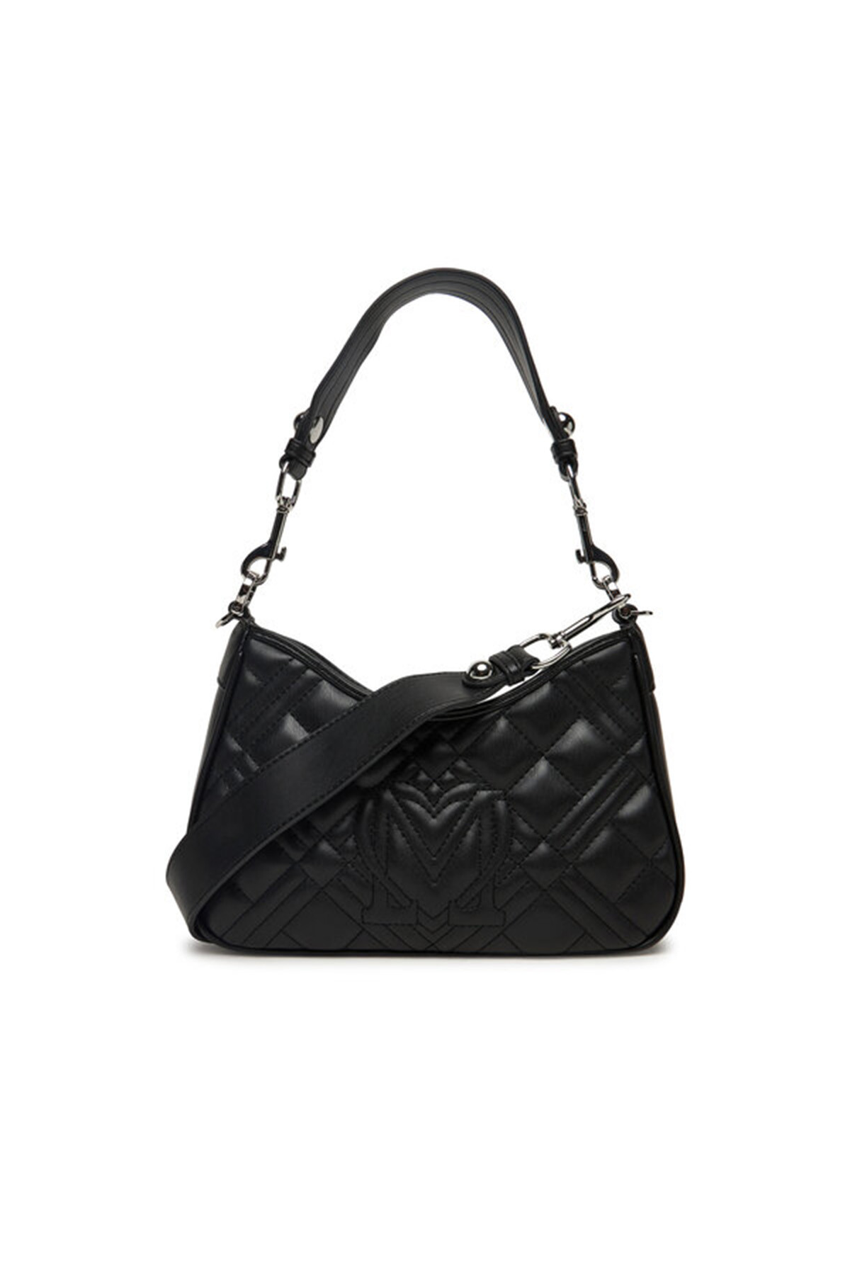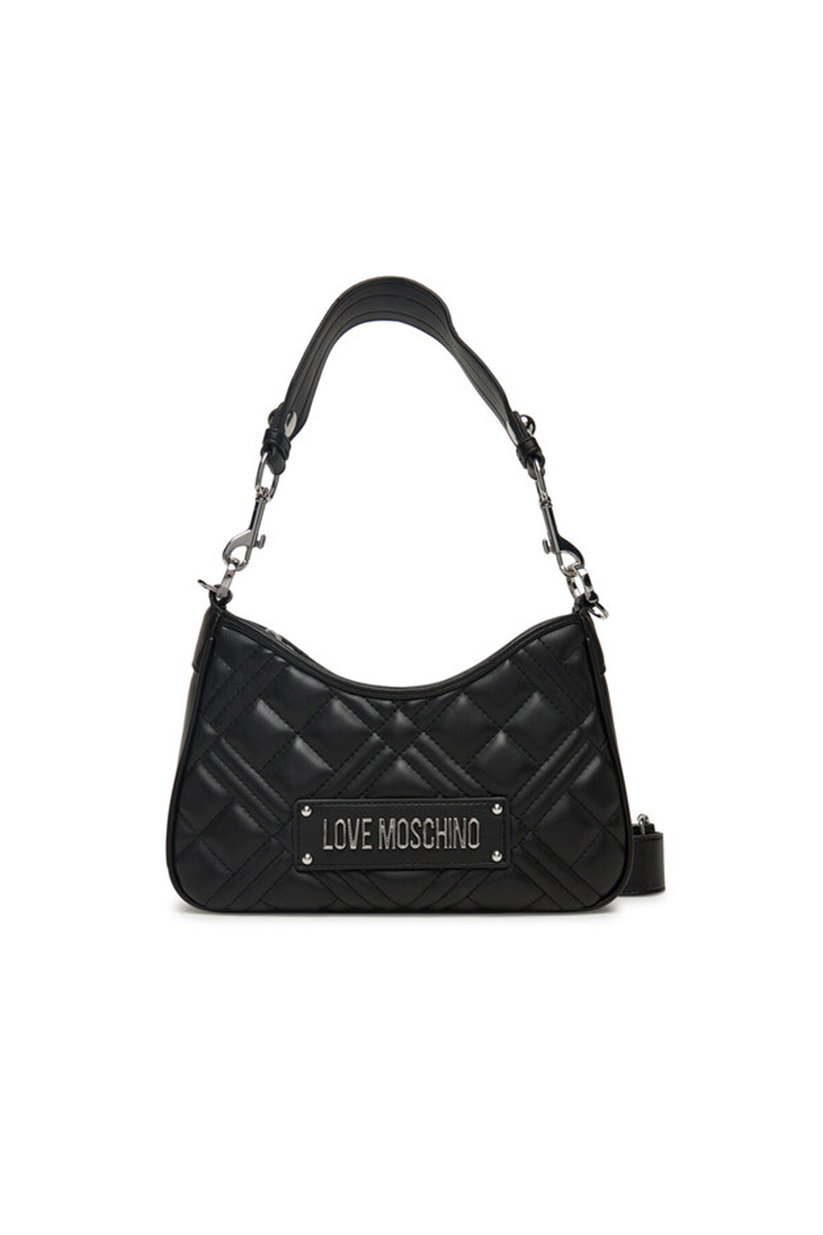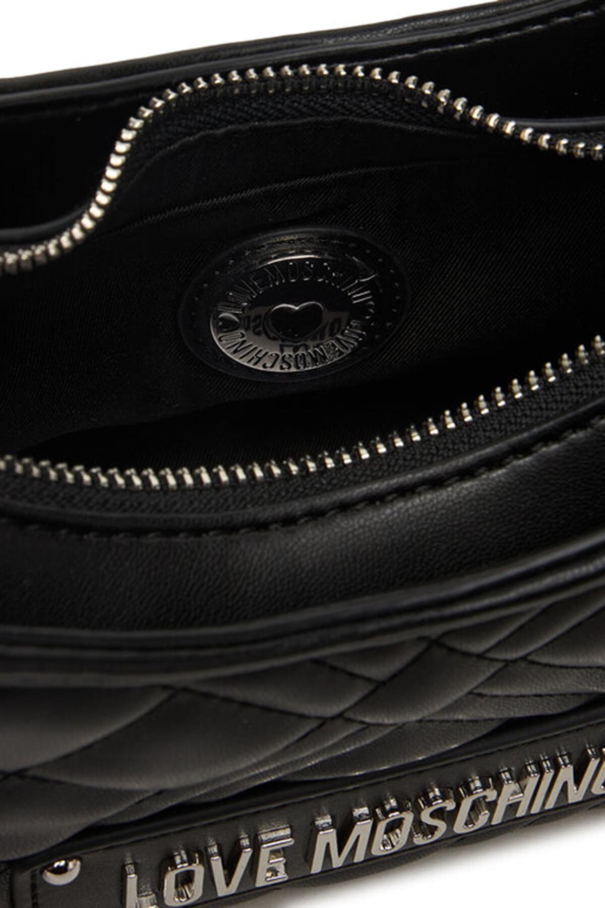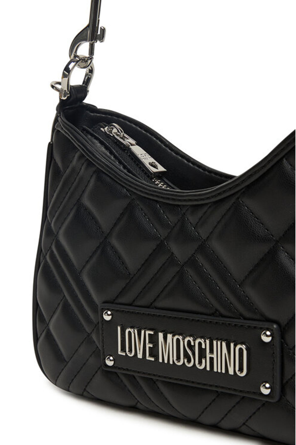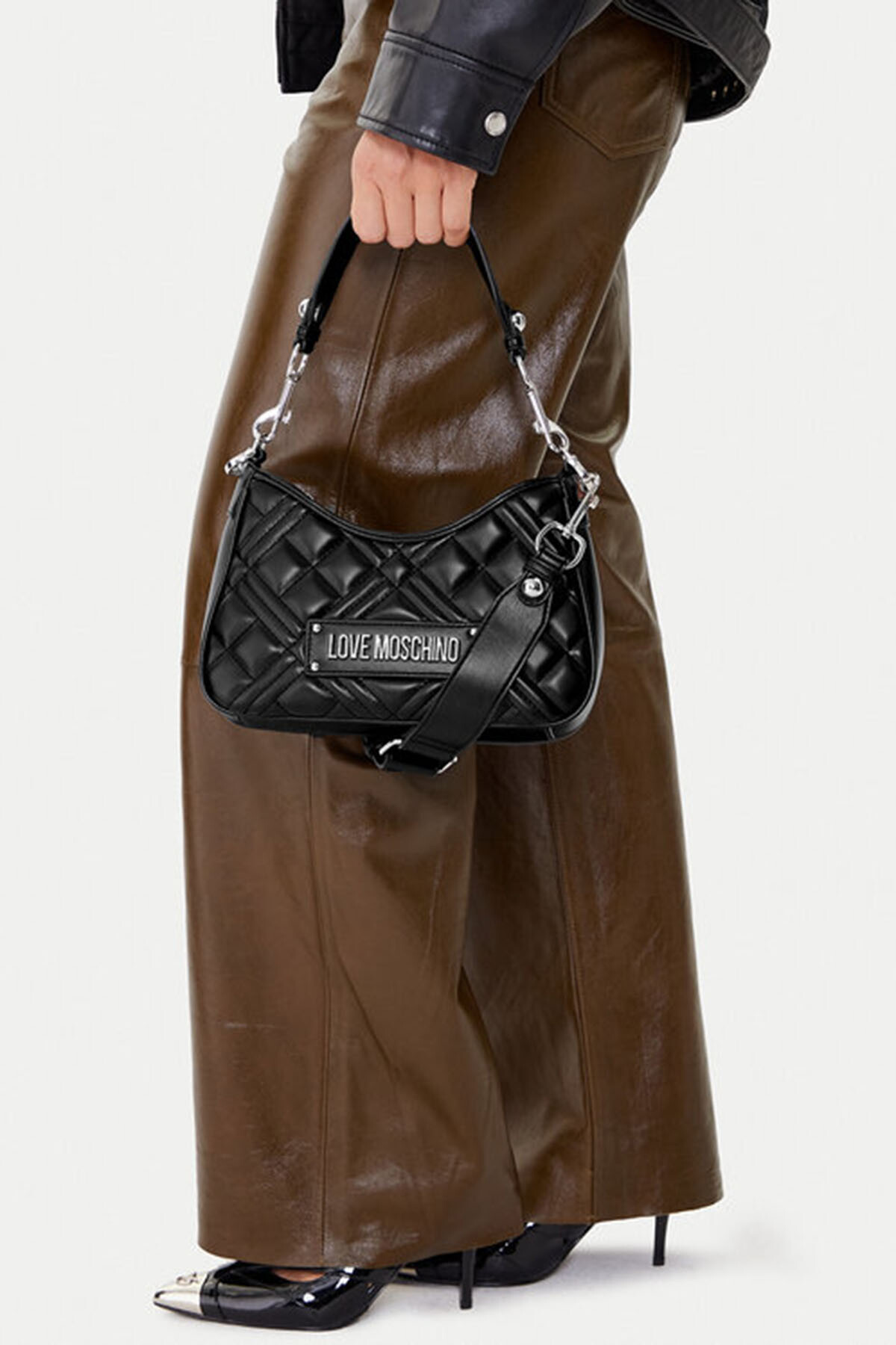 Love Moschino’nun siyah omuz çantası, kapitone yüzey tasarımı ve ön bölümde yer alan metal LOVE MOSCHINO logo plakası ile dikkat çeker.