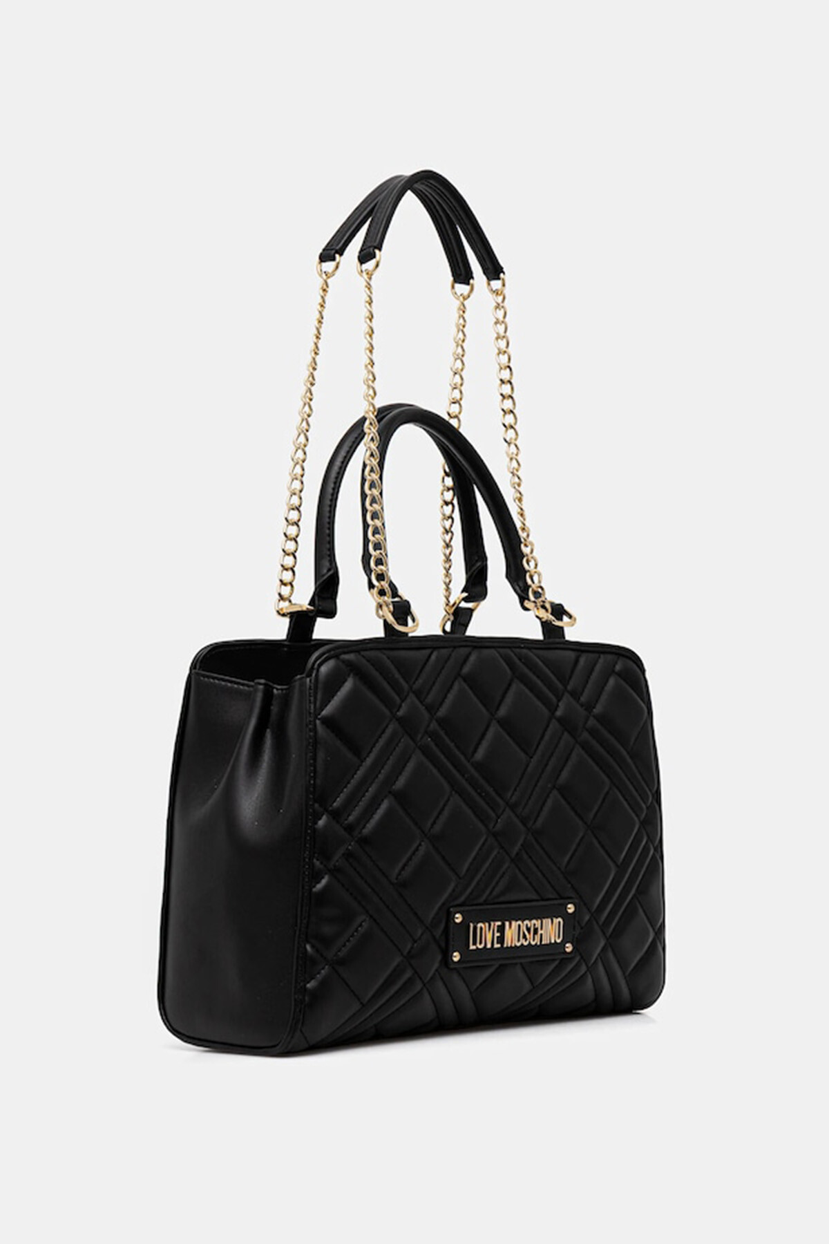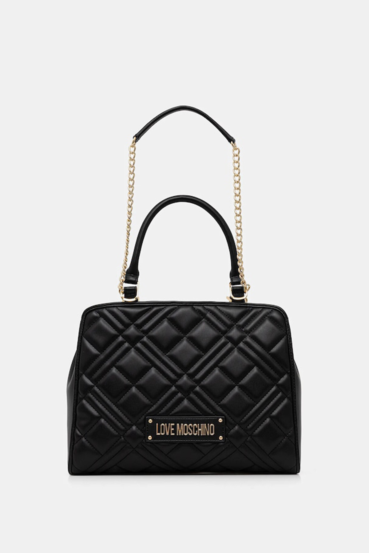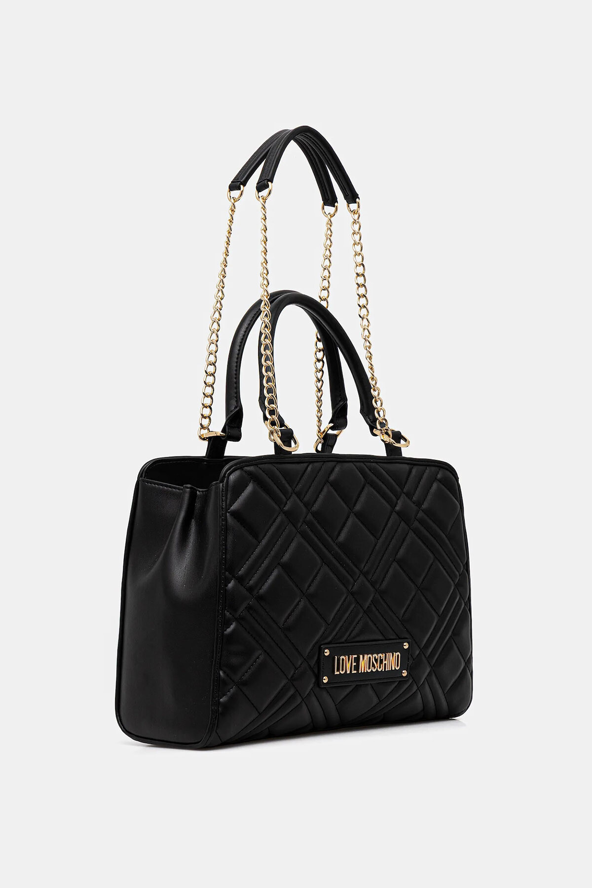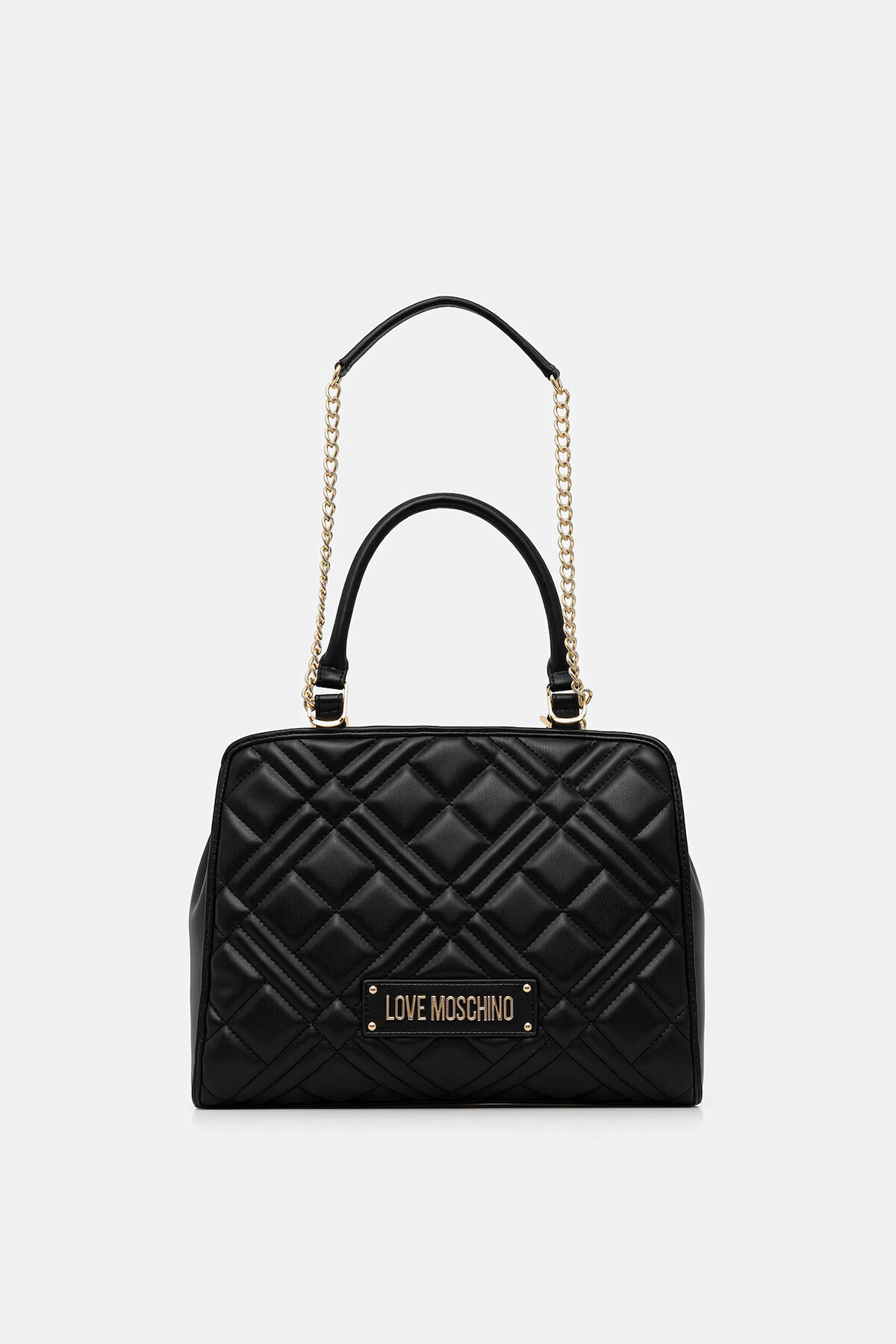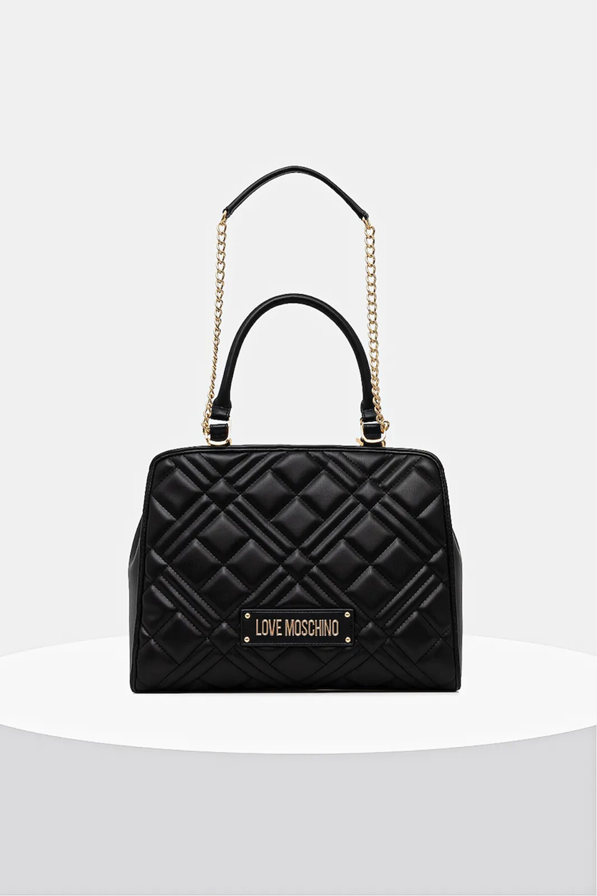 Love Moschino’nun siyah omuz çantası, çapraz kapitone yüzey dokusu ve ön bölümde yer alan gold metal logo plakası ile öne çıkar.