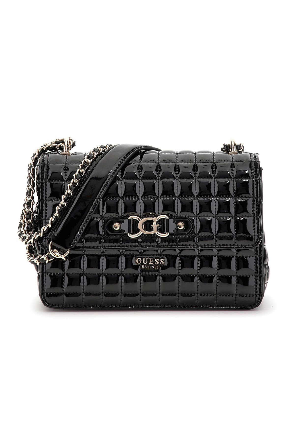 Klasik ve şık bir tasarıma sahip bu omuz çantası, parlak rugan görünümlü yüzeyi ve tüm gövdeyi saran kapitone dikişleriyle dikkat çeker. Ön yüzeyde yer alan birbirine geçmiş halka formundaki metal aksesuar, çantanın zarif tasarımını tamamlar. Ayarlanabilir zincir detaylı askısı çok yönlü bir kullanım sunarken, iç ve dış kısımlardaki fermuarlı cepler fonksiyonelliği artırır.